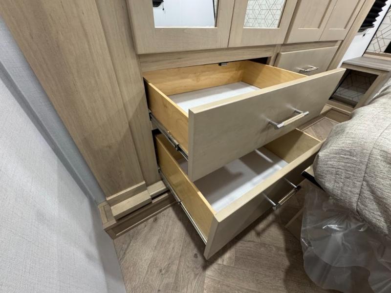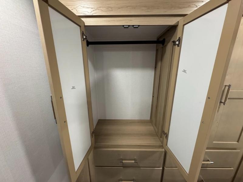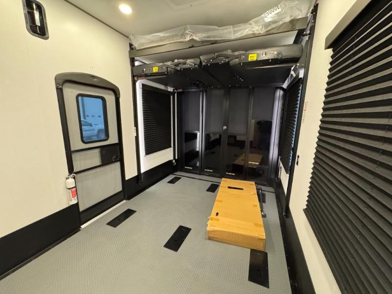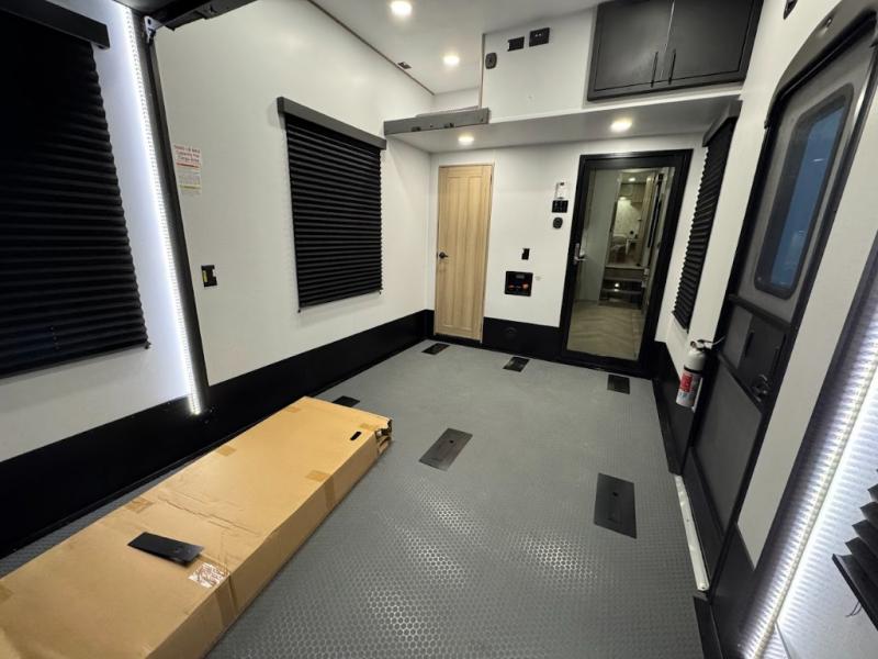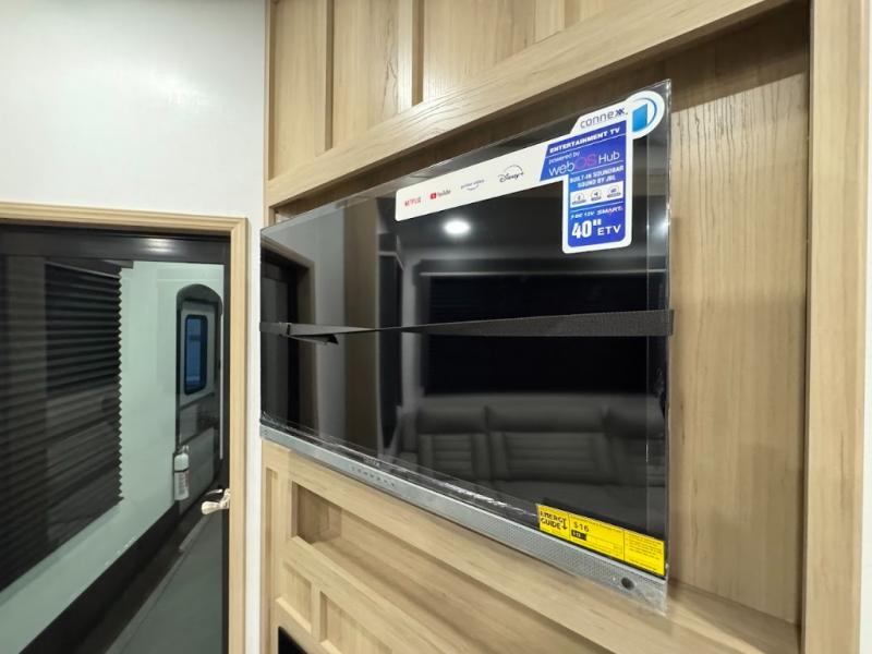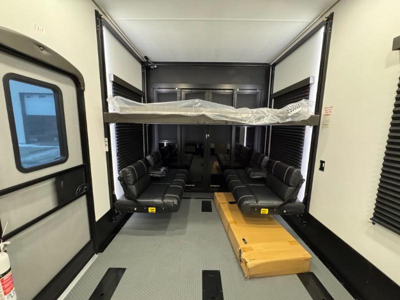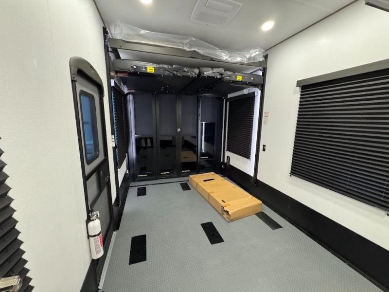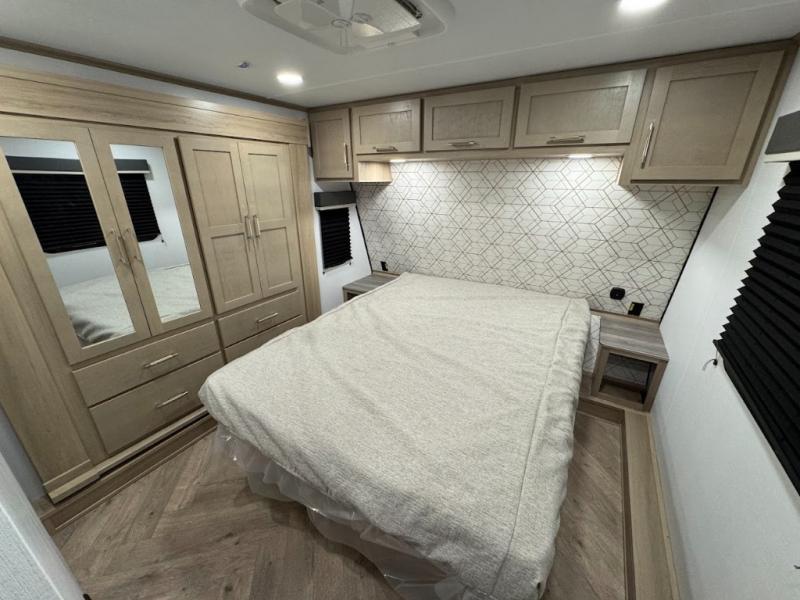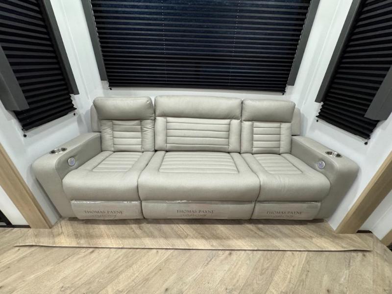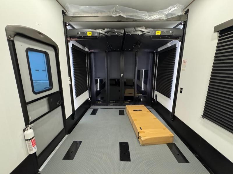 Featuring a spacious king bed with nightstands on each side, this front private bedroom will be your favorite spot to rest! The wardrobe with drawers provides ample storage for your clothes and personal items, helping you stay organized on the road. The bath and a half layout provides convenience and flexibility, ensuring that everyone has their own space to get ready in the morning. The living area is a vibrant hub of entertainment, featuring a reclining sofa with lumbar support and a tilting headrest. The state-of-the-art entertainment center with smart LED TV provides endless hours of fun, while the microwave and sink make meal prep a snap. Further, the garage is designed for ultimate adventure, with ample space for your favorite toys and an electric bed with dual opposing sofas that convert into a comfortable sleeping area.