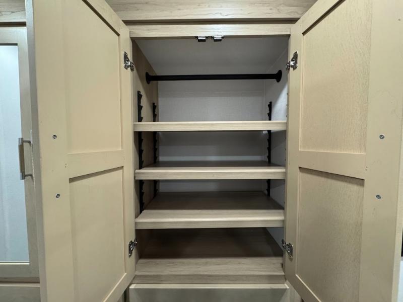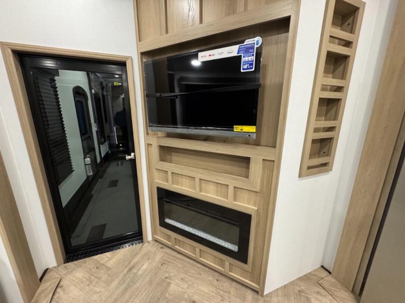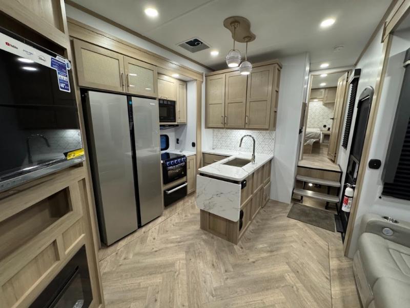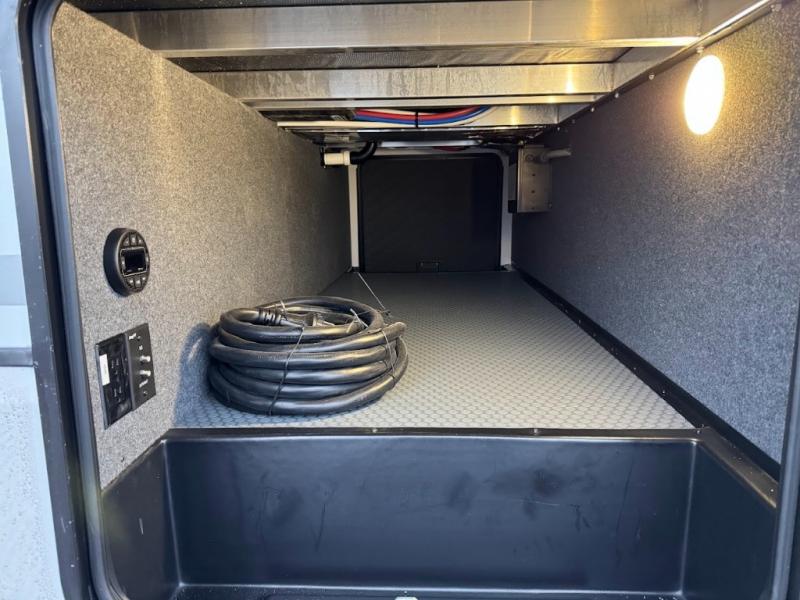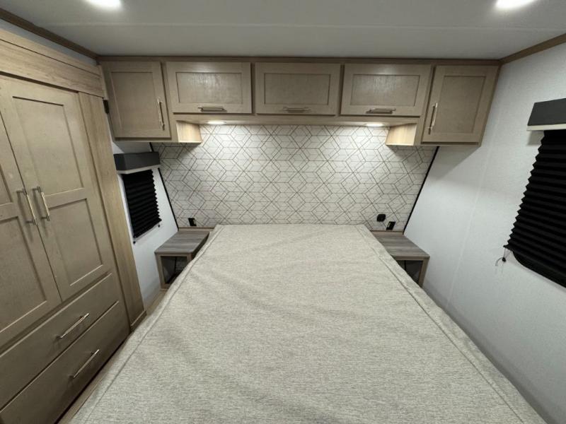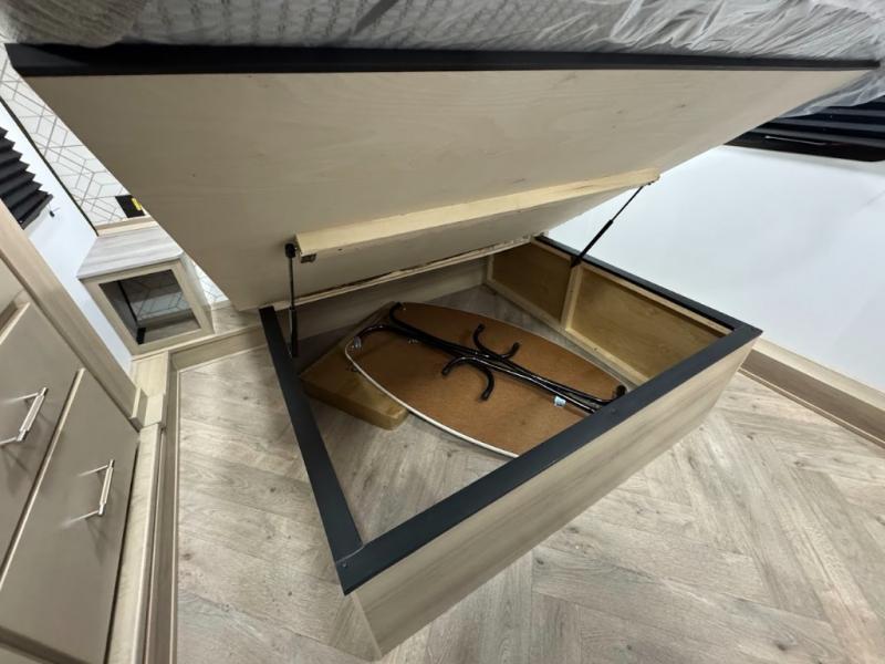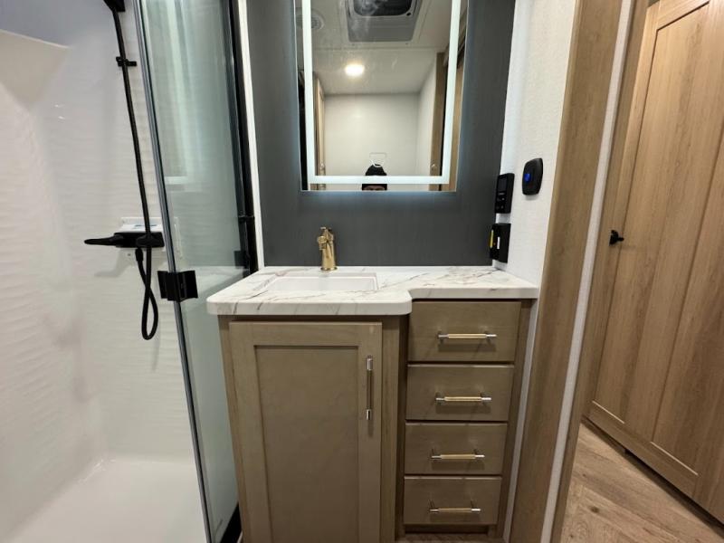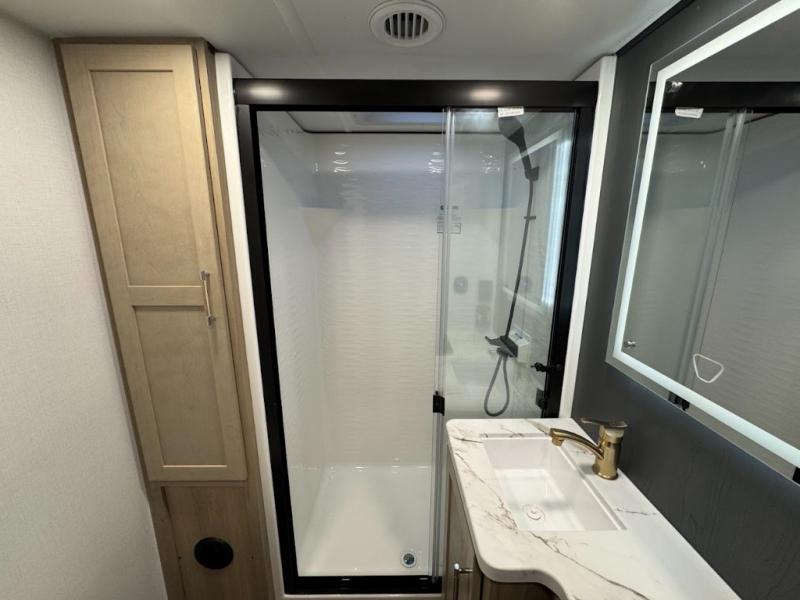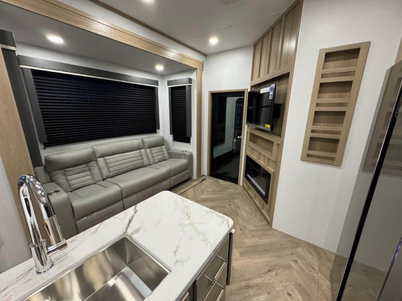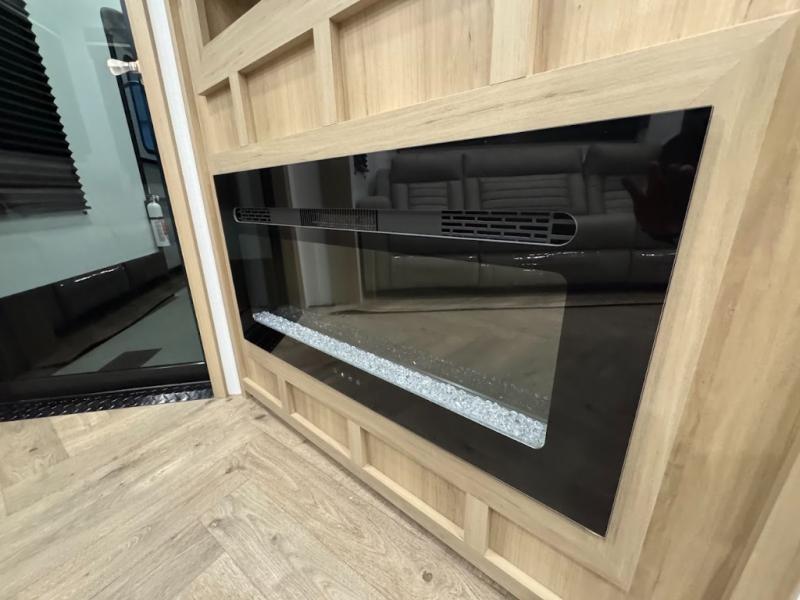 Featuring a spacious king bed with nightstands on each side, this front private bedroom will be your favorite spot to rest! The wardrobe with drawers provides ample storage for your clothes and personal items, helping you stay organized on the road. The bath and a half layout provides convenience and flexibility, ensuring that everyone has their own space to get ready in the morning. The living area is a vibrant hub of entertainment, featuring a reclining sofa with lumbar support and a tilting headrest. The state-of-the-art entertainment center with smart LED TV provides endless hours of fun, while the microwave and sink make meal prep a snap. Further, the garage is designed for ultimate adventure, with ample space for your favorite toys and an electric bed with dual opposing sofas that convert into a comfortable sleeping area.