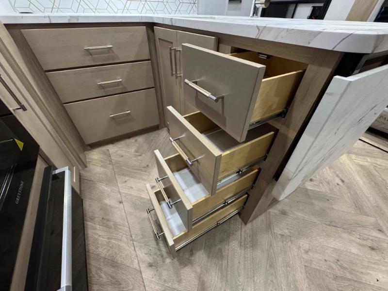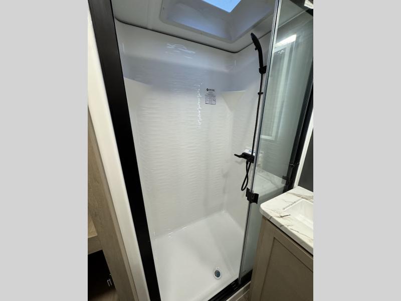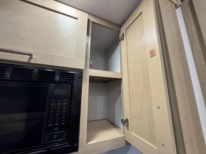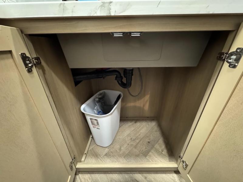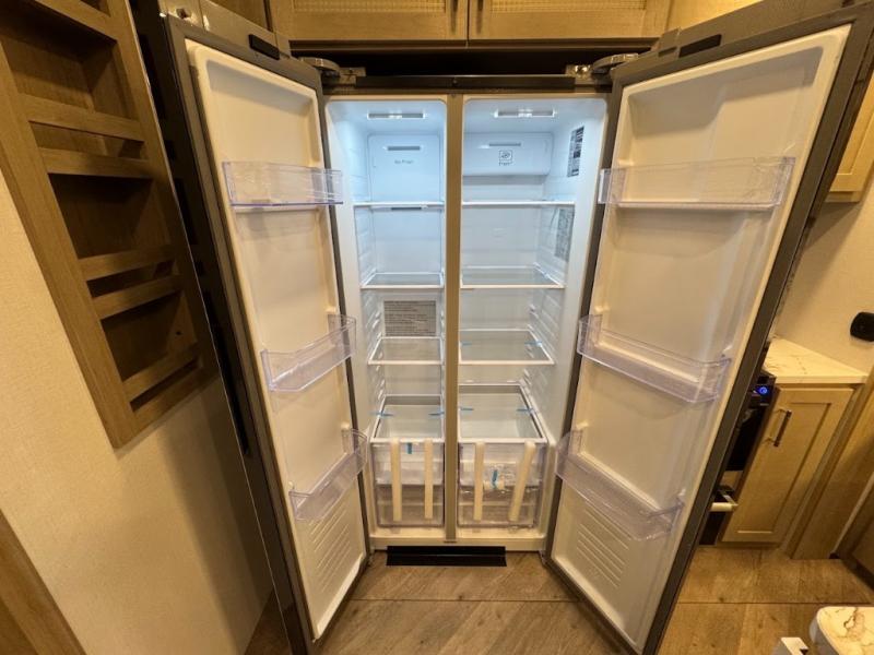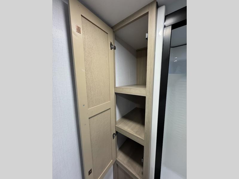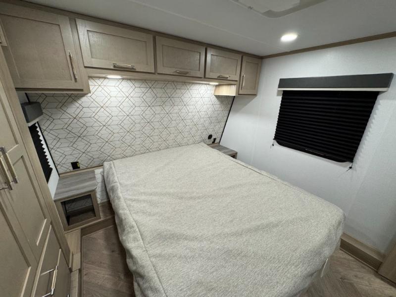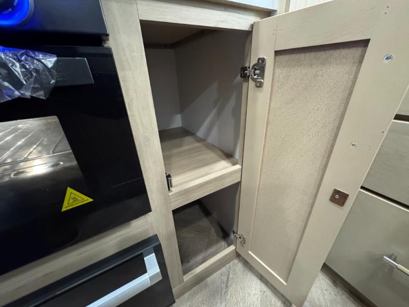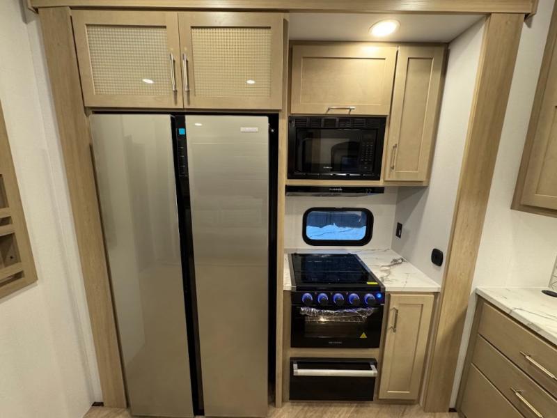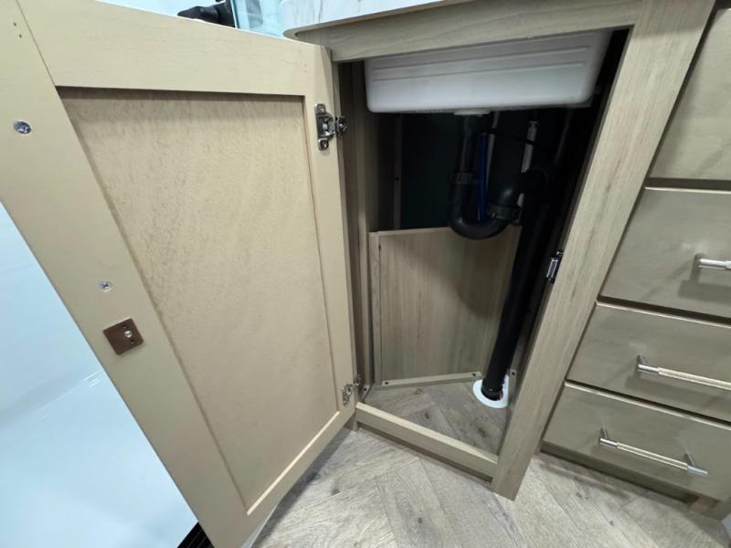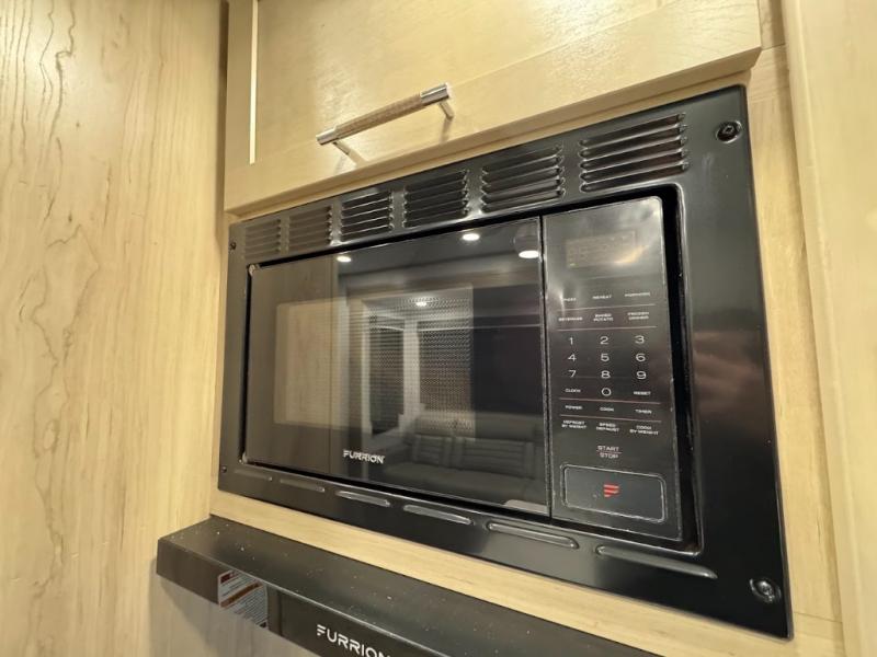Featuring a spacious king bed with nightstands on each side, this front private bedroom will be your favorite spot to rest! The wardrobe with drawers provides ample storage for your clothes and personal items, helping you stay organized on the road. The bath and a half layout provides convenience and flexibility, ensuring that everyone has their own space to get ready in the morning. The living area is a vibrant hub of entertainment, featuring a reclining sofa with lumbar support and a tilting headrest. The state-of-the-art entertainment center with smart LED TV provides endless hours of fun, while the microwave and sink make meal prep a snap. Further, the garage is designed for ultimate adventure, with ample space for your favorite toys and an electric bed with dual opposing sofas that convert into a comfortable sleeping area.