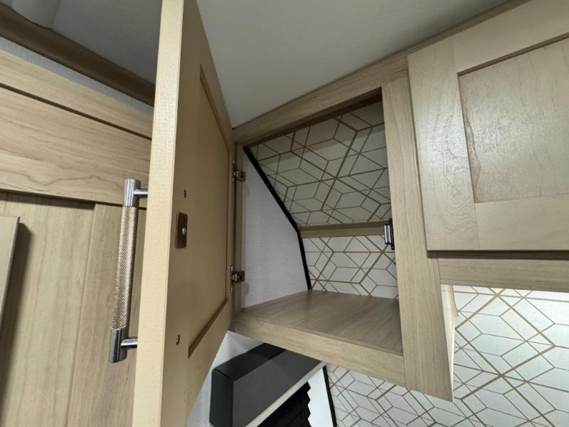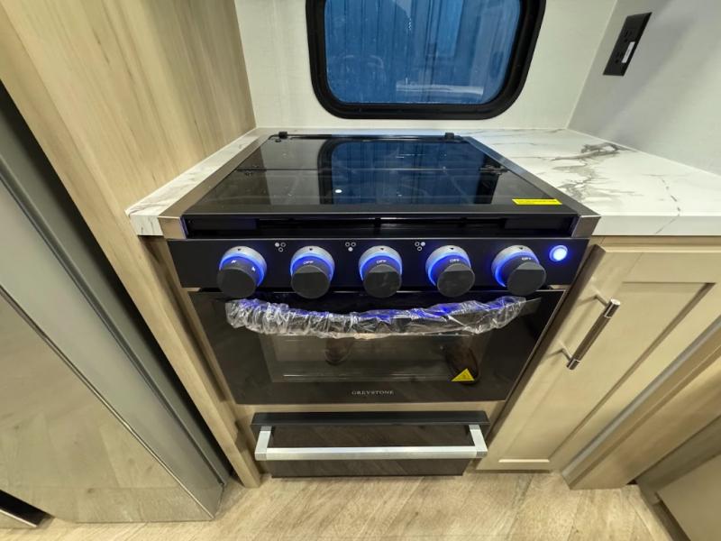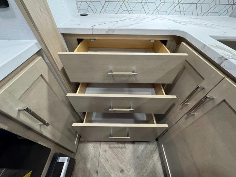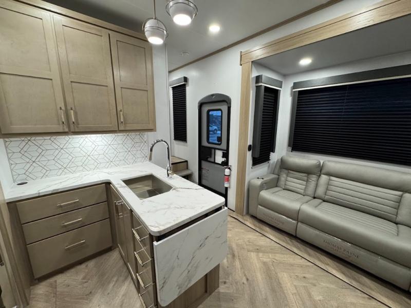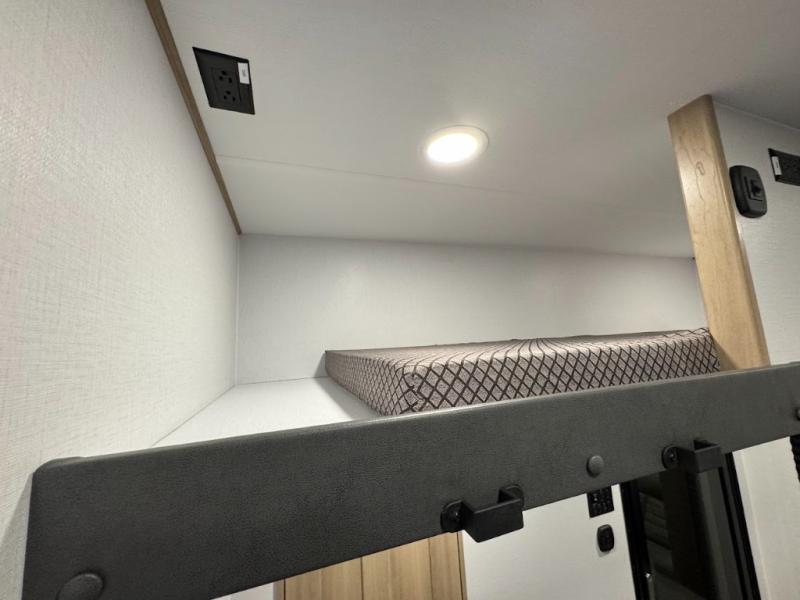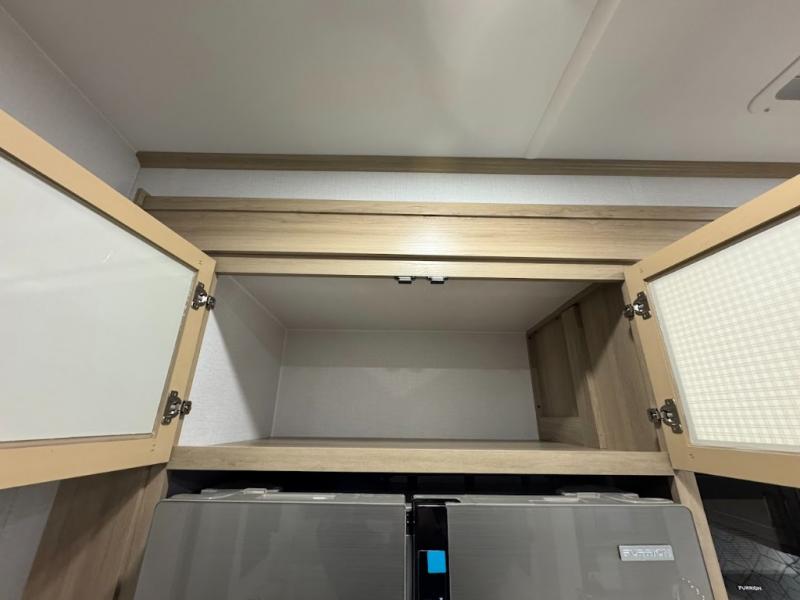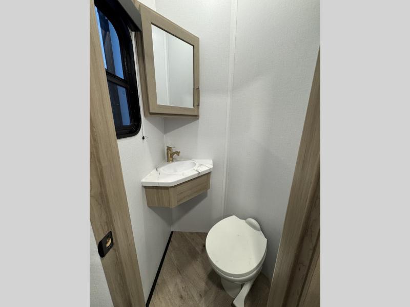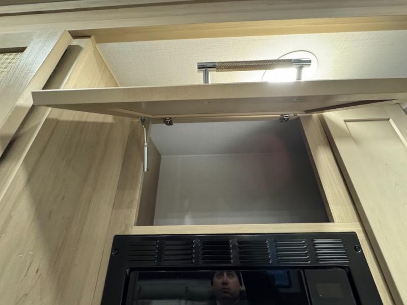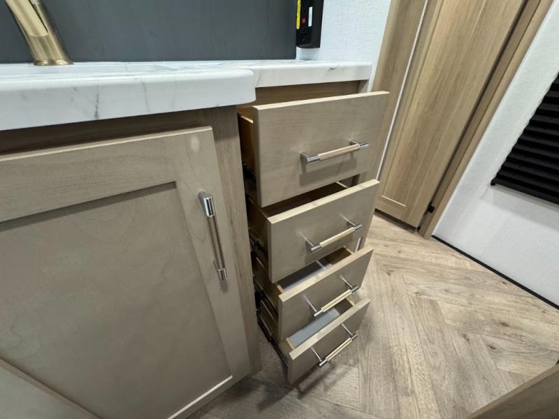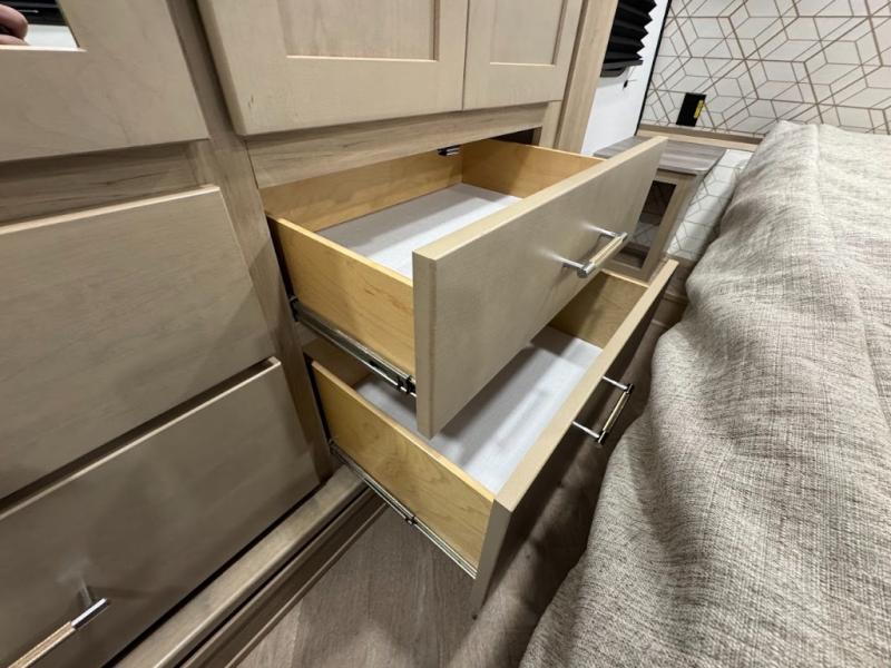Featuring a spacious king bed with nightstands on each side, this front private bedroom will be your favorite spot to rest! The wardrobe with drawers provides ample storage for your clothes and personal items, helping you stay organized on the road. The bath and a half layout provides convenience and flexibility, ensuring that everyone has their own space to get ready in the morning. The living area is a vibrant hub of entertainment, featuring a reclining sofa with lumbar support and a tilting headrest. The state-of-the-art entertainment center with smart LED TV provides endless hours of fun, while the microwave and sink make meal prep a snap. Further, the garage is designed for ultimate adventure, with ample space for your favorite toys and an electric bed with dual opposing sofas that convert into a comfortable sleeping area.