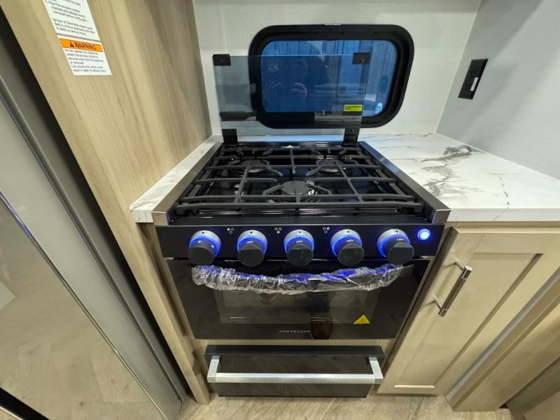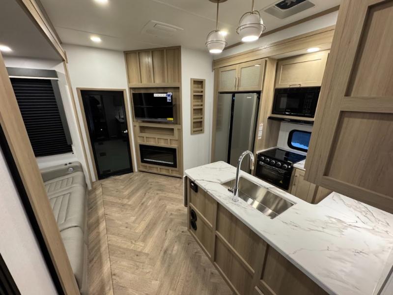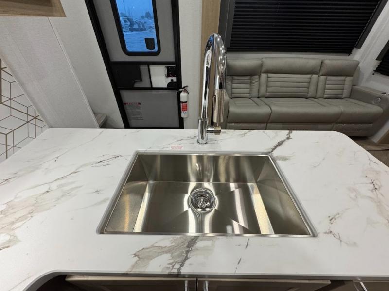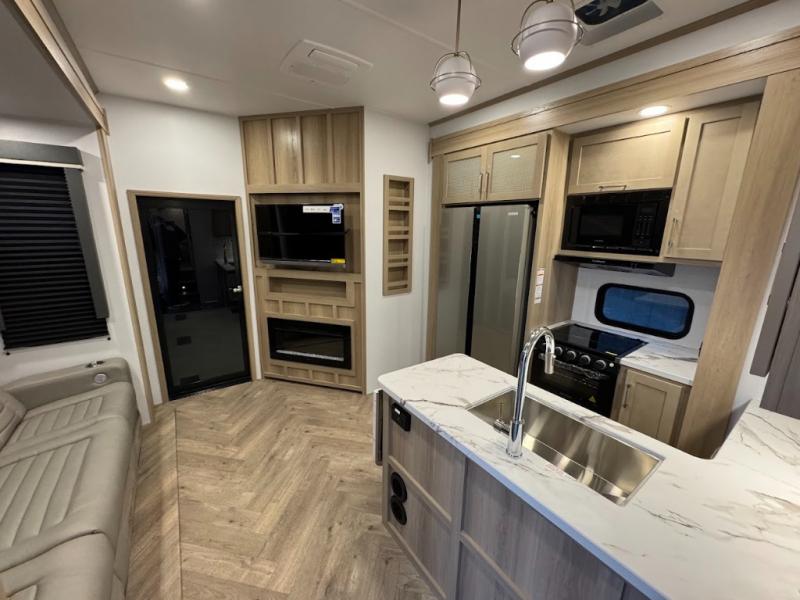 With any Keystone Raptor Carbon Series toy hauler fifth wheel, you will enjoy a new chassis with a larger pass-through storage and a new front cap with LED lighting. There is also an upgraded MORryde CRE3000 suspension, a 6-point hydraulic Level-Up system, and a Nautilus exterior convenience center to easily access all your hookups. Inside, you'll love the hardwood soft-close cabinet doors, pressed countertops, and Thomas Payne furniture. The Extreme Weather Package will add protection against the elements, and the on-demand tankless water heater will provide endless hot showers!