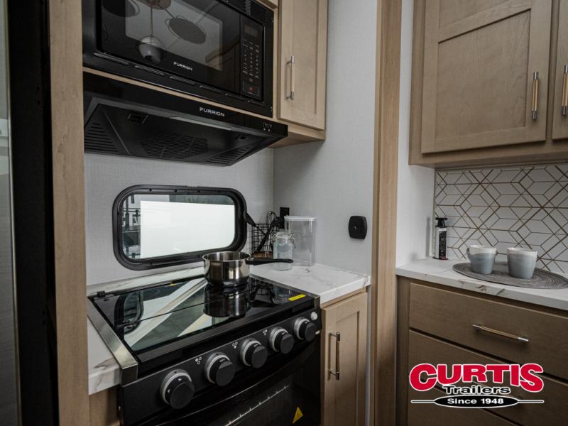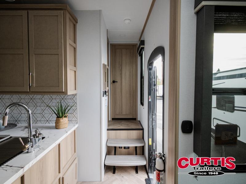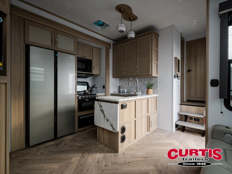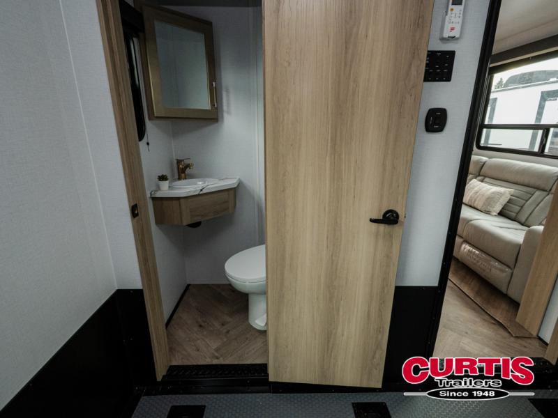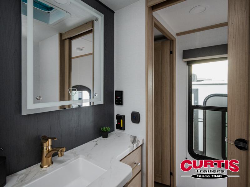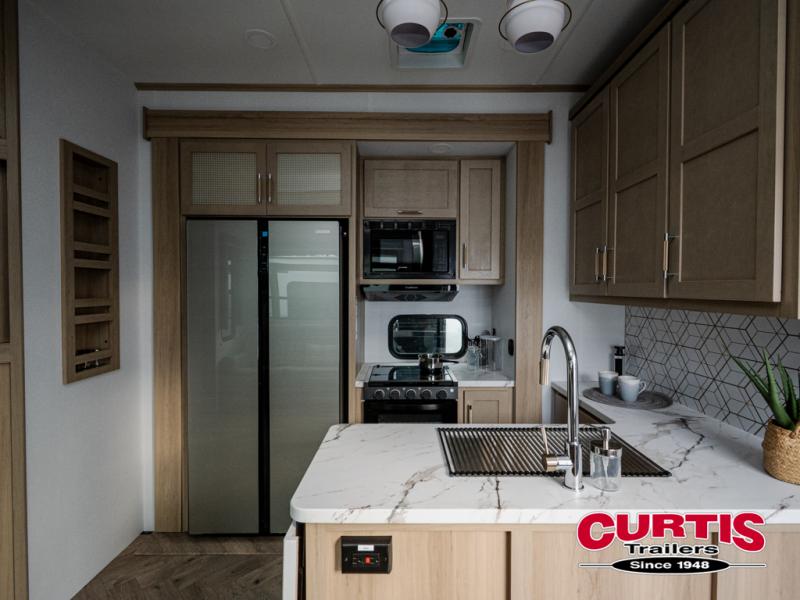 With any Keystone Raptor Carbon Series toy hauler fifth wheel, you will enjoy a new chassis with a larger pass-through storage and a new front cap with LED lighting. There is also an upgraded MORryde CRE3000 suspension, a 6-point hydraulic Level-Up system, and a Nautilus exterior convenience center to easily access all your hookups. Inside, you'll love the hardwood soft-close cabinet doors, pressed countertops, and Thomas Payne furniture. The Extreme Weather Package will add protection against the elements, and the on-demand tankless water heater will provide endless hot showers!