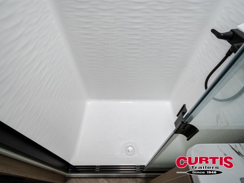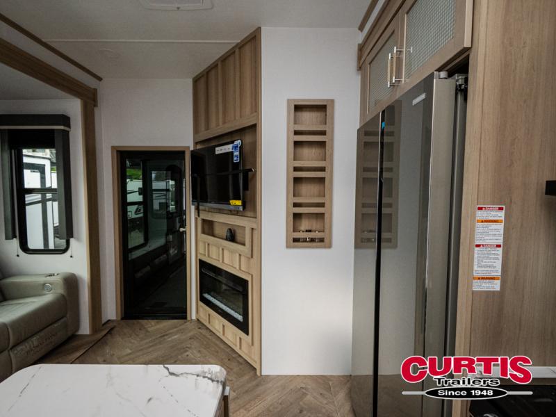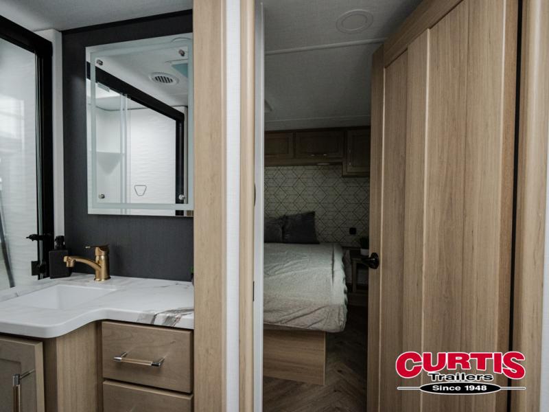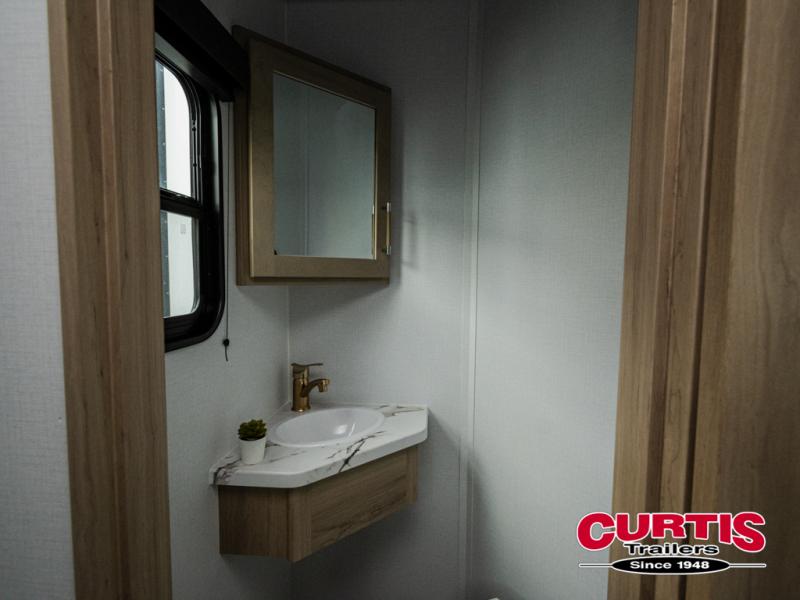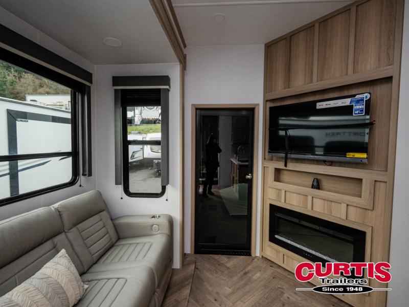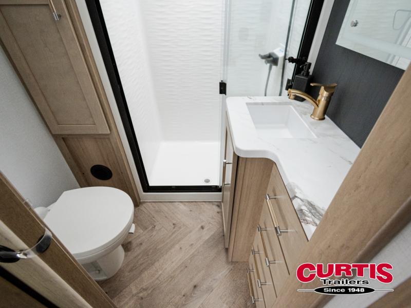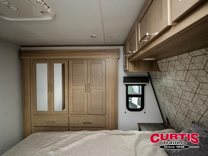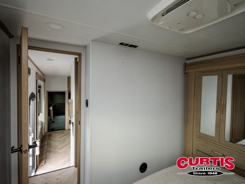 Featuring a spacious king bed with nightstands on each side, this front private bedroom will be your favorite spot to rest! The wardrobe with drawers provides ample storage for your clothes and personal items, helping you stay organized on the road. The bath and a half layout provides convenience and flexibility, ensuring that everyone has their own space to get ready in the morning. The living area is a vibrant hub of entertainment, featuring a reclining sofa with lumbar support and a tilting headrest. The state-of-the-art entertainment center with smart LED TV provides endless hours of fun, while the microwave and sink make meal prep a snap. Further, the garage is designed for ultimate adventure, with ample space for your favorite toys and an electric bed with dual opposing sofas that convert into a comfortable sleeping area.