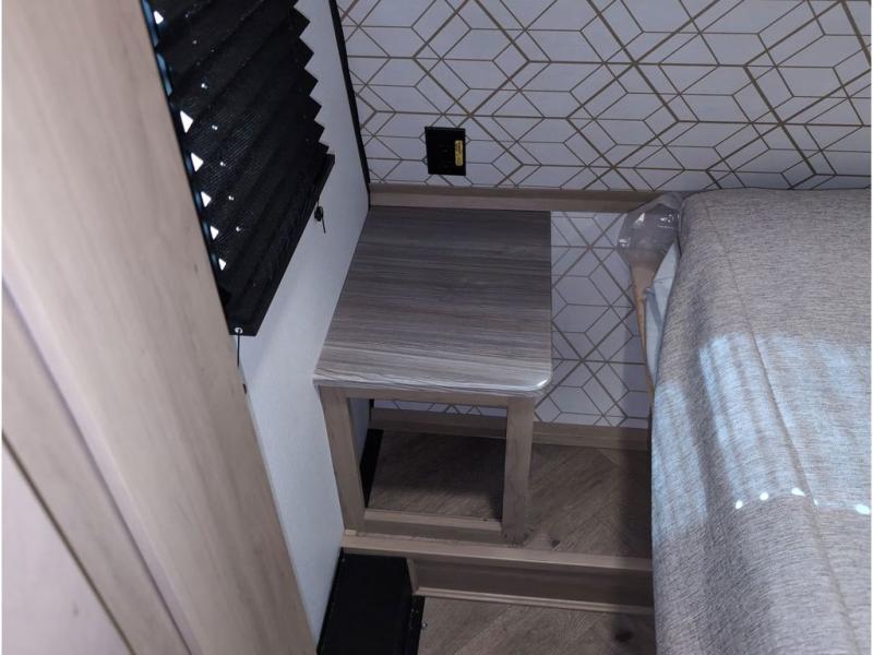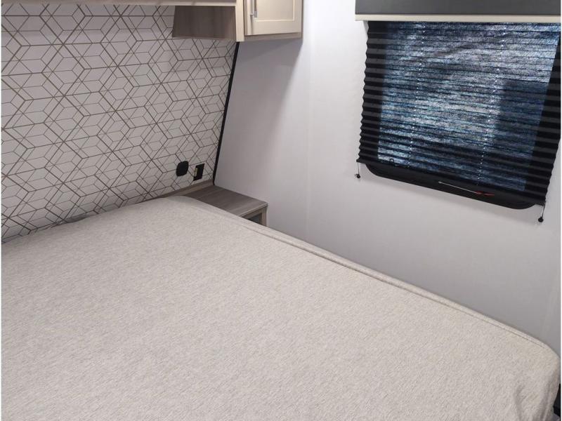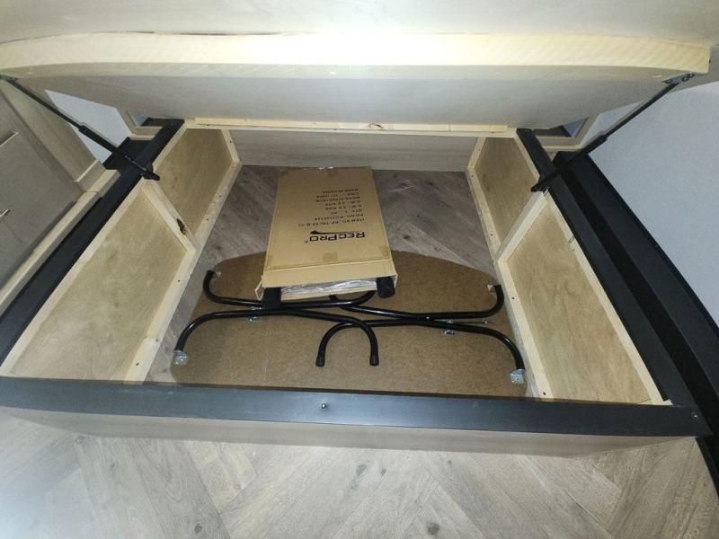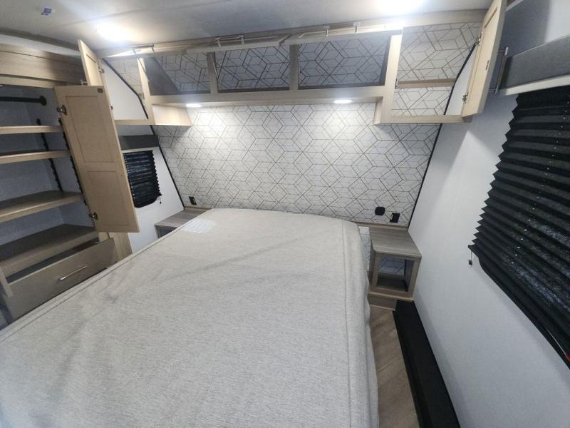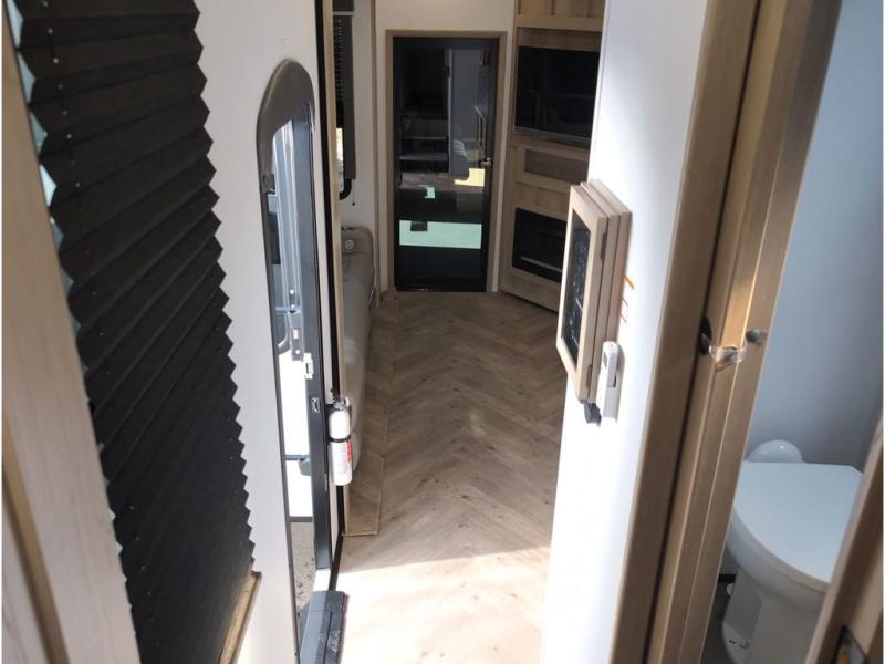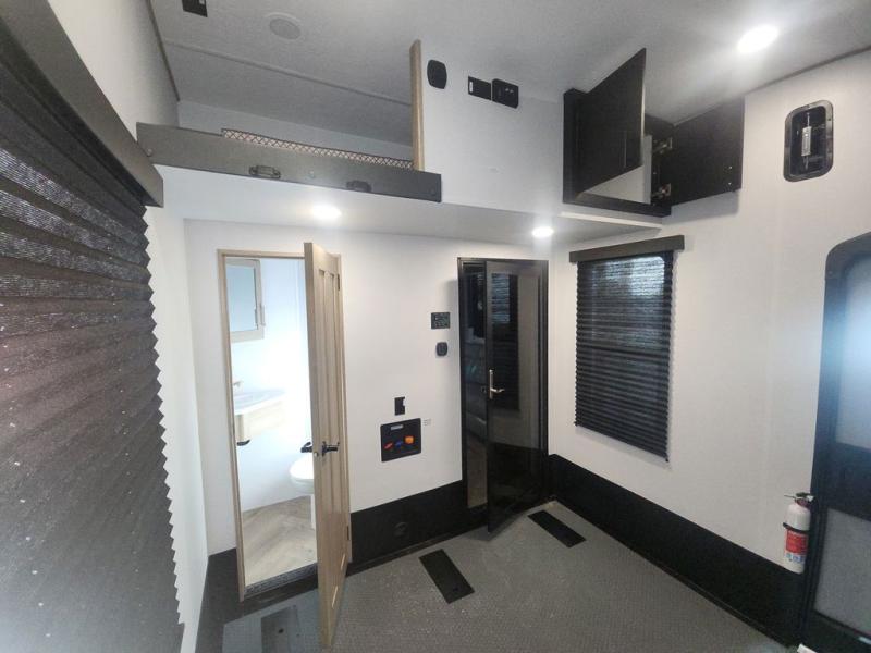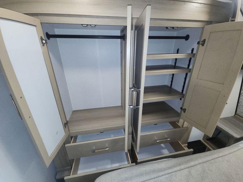Featuring a spacious king bed with nightstands on each side, this front private bedroom will be your favorite spot to rest! The wardrobe with drawers provides ample storage for your clothes and personal items, helping you stay organized on the road. The bath and a half layout provides convenience and flexibility, ensuring that everyone has their own space to get ready in the morning. The living area is a vibrant hub of entertainment, featuring a reclining sofa with lumbar support and a tilting headrest. The state-of-the-art entertainment center with smart LED TV provides endless hours of fun, while the microwave and sink make meal prep a snap. Further, the garage is designed for ultimate adventure, with ample space for your favorite toys and an electric bed with dual opposing sofas that convert into a comfortable sleeping area.