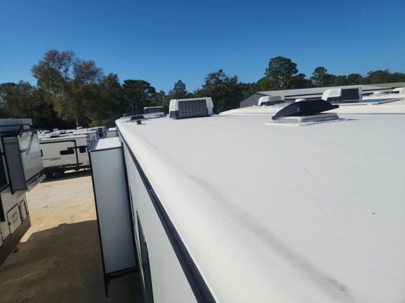 With any Keystone Raptor Carbon Series toy hauler fifth wheel, you will enjoy a new chassis with a larger pass-through storage and a new front cap with LED lighting. There is also an upgraded MORryde CRE3000 suspension, a 6-point hydraulic Level-Up system, and a Nautilus exterior convenience center to easily access all your hookups. Inside, you'll love the hardwood soft-close cabinet doors, pressed countertops, and Thomas Payne furniture. The Extreme Weather Package will add protection against the elements, and the on-demand tankless water heater will provide endless hot showers!