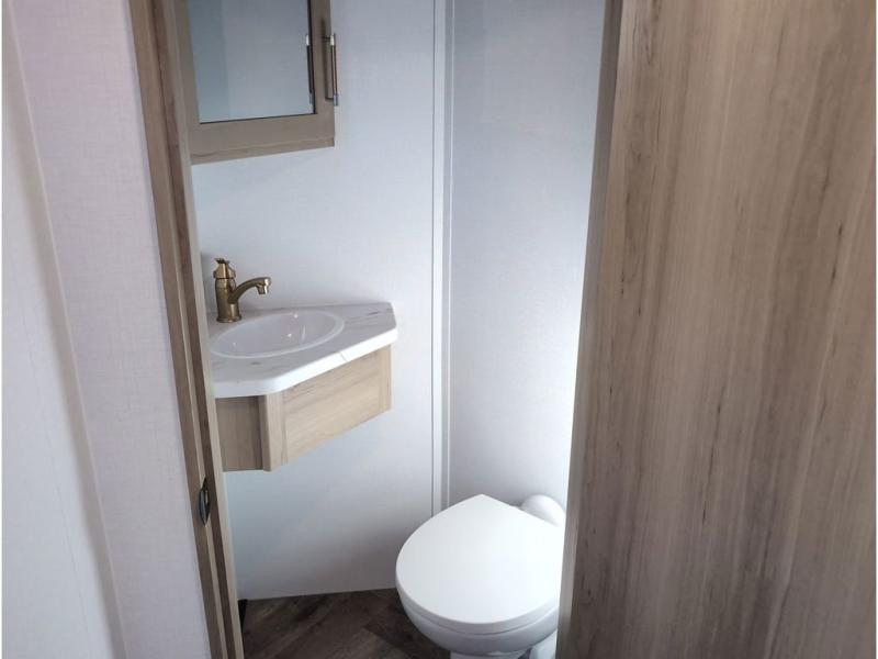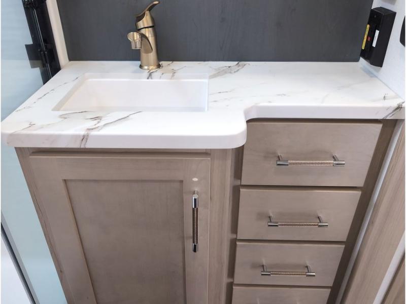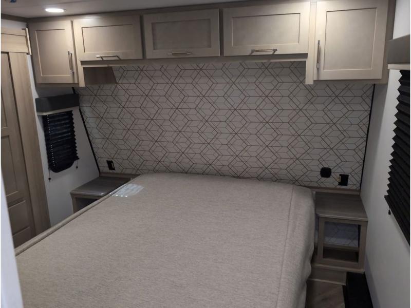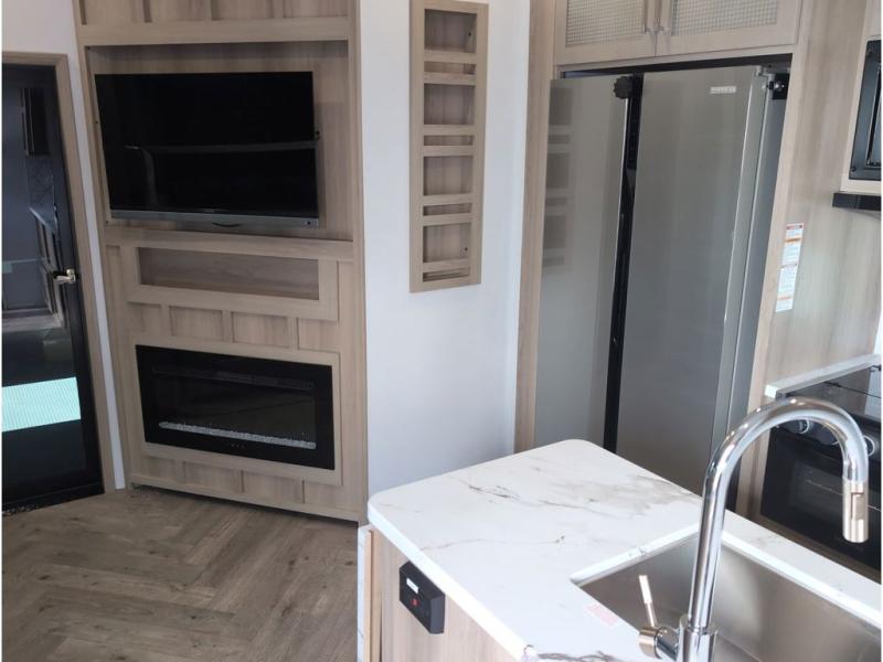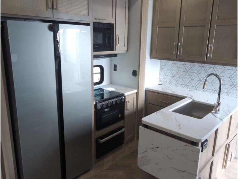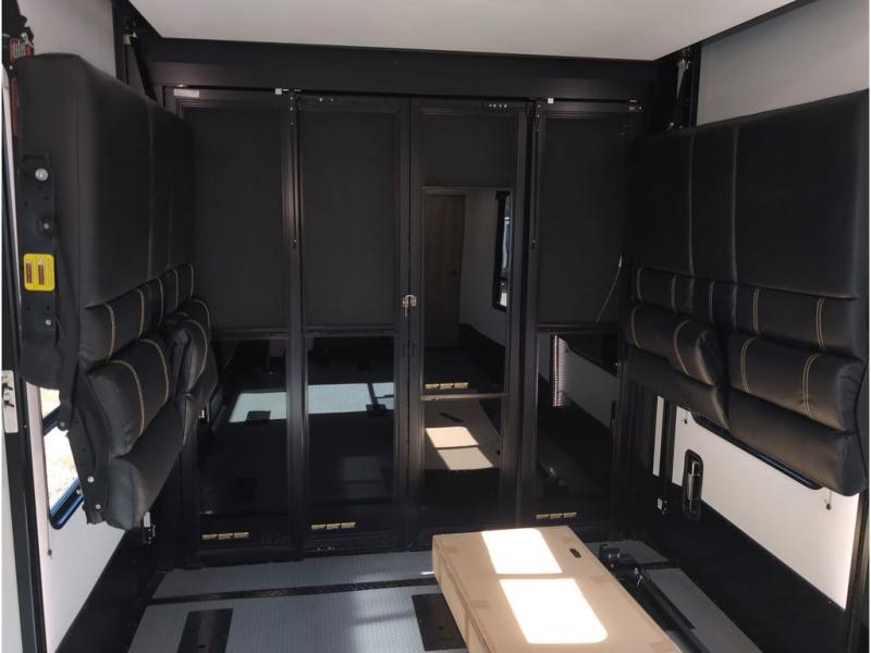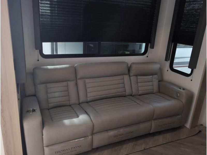 Featuring a spacious king bed with nightstands on each side, this front private bedroom will be your favorite spot to rest! The wardrobe with drawers provides ample storage for your clothes and personal items, helping you stay organized on the road. The bath and a half layout provides convenience and flexibility, ensuring that everyone has their own space to get ready in the morning. The living area is a vibrant hub of entertainment, featuring a reclining sofa with lumbar support and a tilting headrest. The state-of-the-art entertainment center with smart LED TV provides endless hours of fun, while the microwave and sink make meal prep a snap. Further, the garage is designed for ultimate adventure, with ample space for your favorite toys and an electric bed with dual opposing sofas that convert into a comfortable sleeping area.
