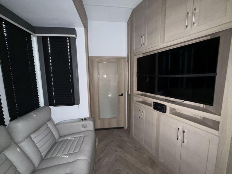 Invite the whole gang as this fifth wheel not only carries your ATV, motorcycles, and/or other outdoor toys to your destination in the 17' separate garage. The garage includes an electric bed with dual opposing sofas underneath, plus an optional second electric bed with sofas. There is also a full bath here for your guests plus washer and dryer prep! The kitchen offers a peninsula countertop with a large farmhouse style sink, appliances to whip up warm meals and heat leftovers, and a pantry to store snacks and more. There is a second full bathroom next to the front bedroom which offers a king bed, wireless phone chargers, and plenty of storage for your clothing including a slide out wardrobe. You will also enjoy a 50" LED TV with surround sound, a second pantry for all of your goodies, a 14' electric awning as well as a single 30 gallon fuel tank to keep the fun going all weekend long!