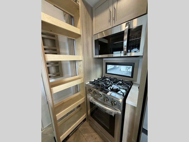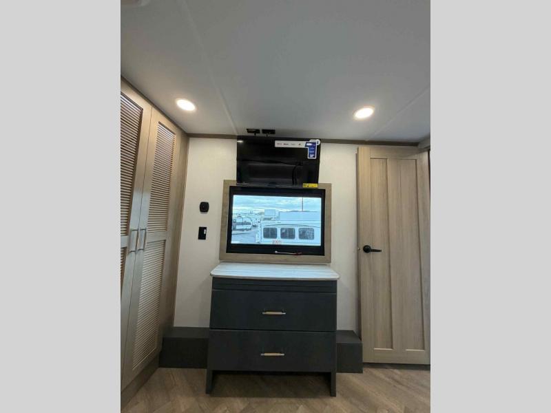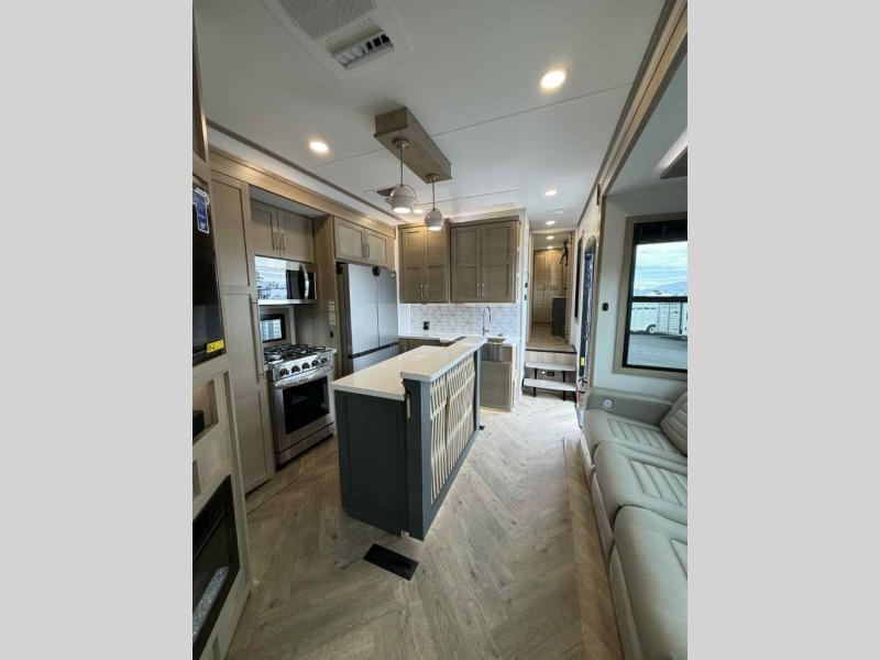 You will have everything you need for a comfortable camping trip and then some with this toy hauler! Load your toys into the 16' garage area with the Lippert Power Play motorized ramp door and secure them with 5,000 lb. frame welded tie-downs. The garage also has an electric bed above dual opposing sofas with a loft with a twin bed and a half bathroom. Create your best meals with the four-burner cooktop and enjoy the company of others sitting at the kitchen island with three bar stools while you prepare it. Relax in true comfort on the 4-seat recliner across from the entertainment center with a fireplace. When you're ready to wind down your nights, take a hot shower in the full bathroom then head directly into the front private bedroom which features a king bed suite with a large front wardrobe for clothing storage, and washer/dryer prep in case you wish to add appliances so you can wash your clothes while you are away!