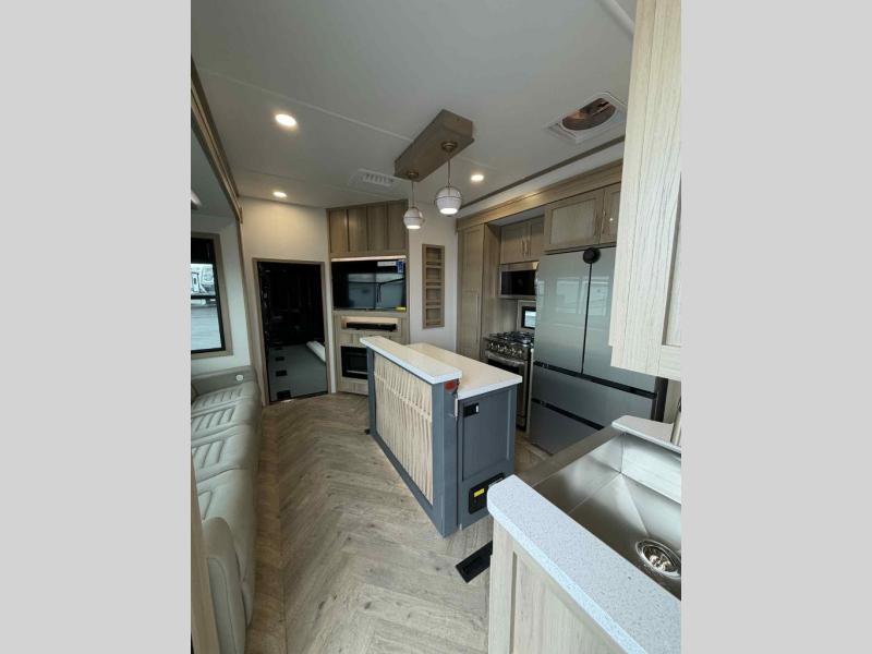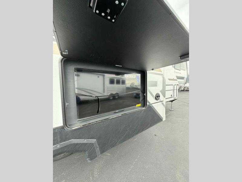Experience a breath of fresh air with one of these Keystone RV Raptor fifth wheel toy haulers! Their rugged construction consists of a one-piece Alpha Super Flex TPO roof membrane, Dyna Span floor decking, and 5,000 lb. frame-welded tie- downs to keep your toys in place as you travel. Some unexpected conveniences you will appreciate include an Omni-Chill A/C system to keep you cool on those hot summer days, a Furrion backup camera, MaxTurn™ technology with a Helux™ pin box, and a Generation 3 iN-Command smart automation system with Global Connect to make life easier. There is also designer style vinyl flooring throughout, along with new ceiling treatment with LED accent lighting, beach wood and white cabinetry, and many more interior comforts!