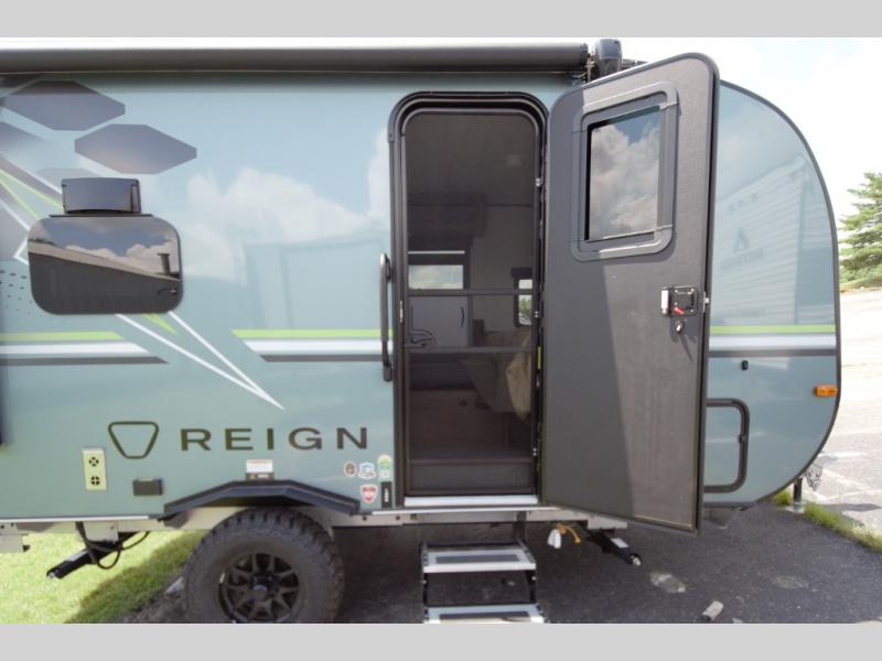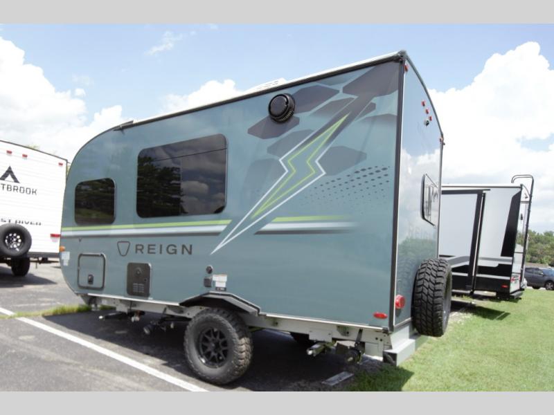 The Reign series is engineered for durability with a 100% composite floor, exclusive automotive-finished aluminum exterior, and walkable roof. Tinted safety glass windows and quick drop stabilizer jacks add to your comfort and convenience at every campsite.