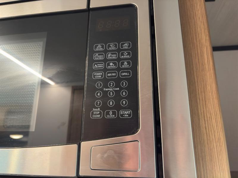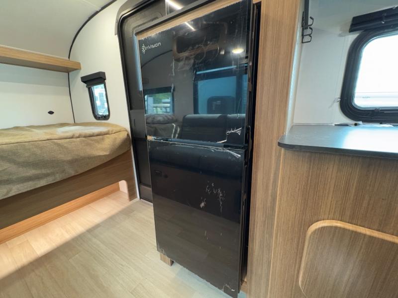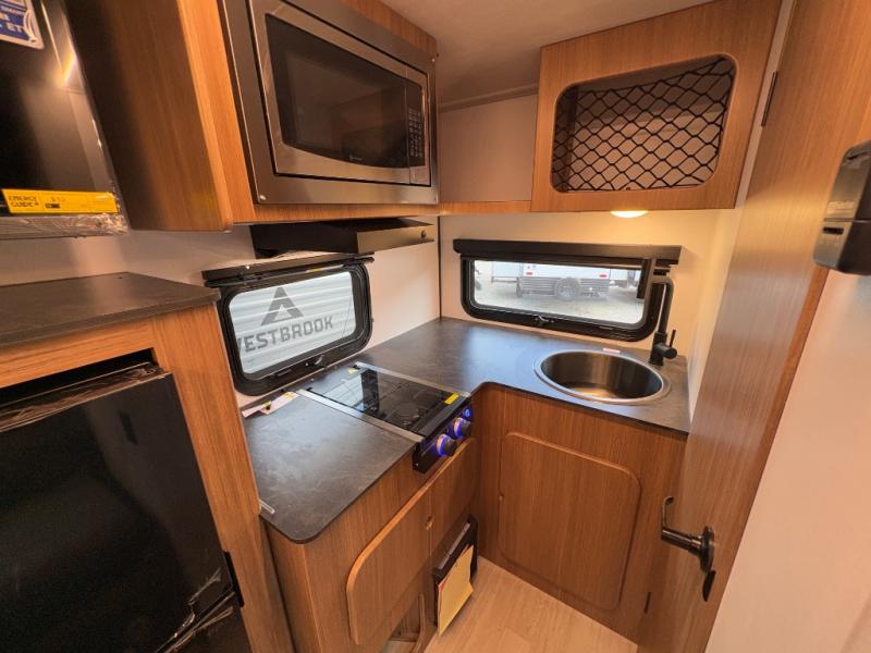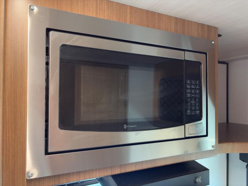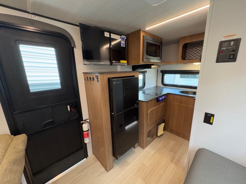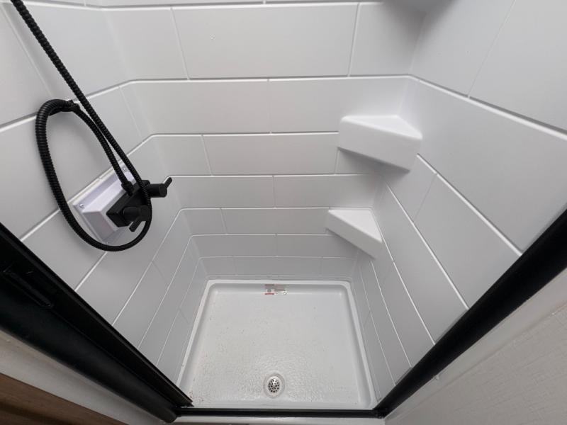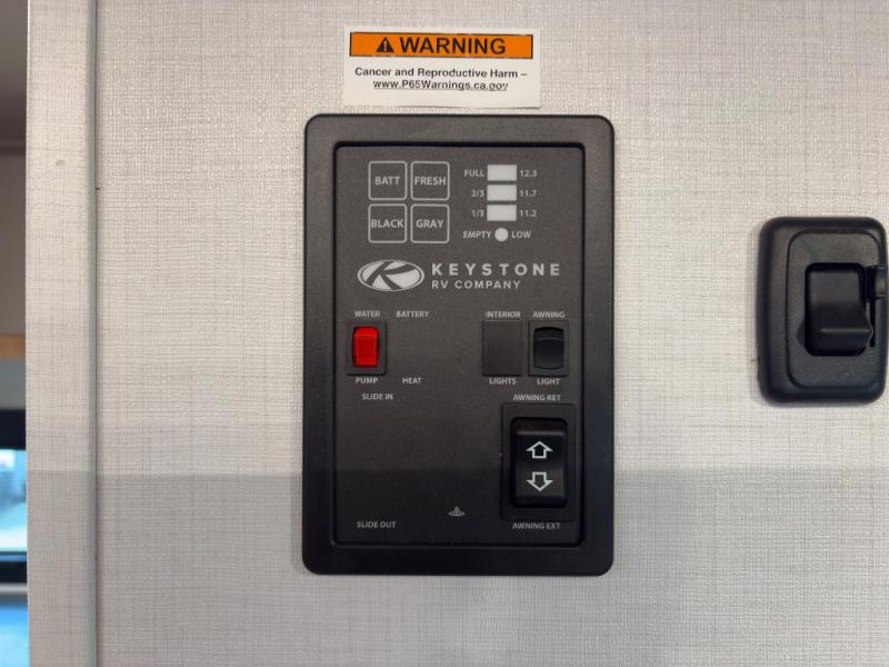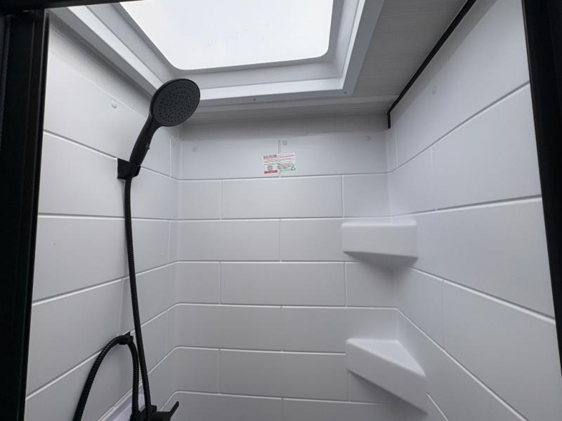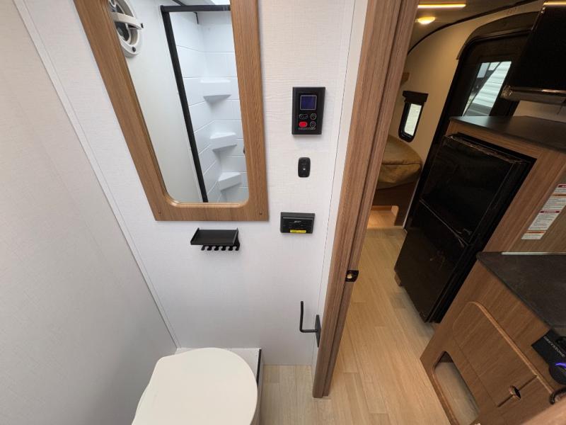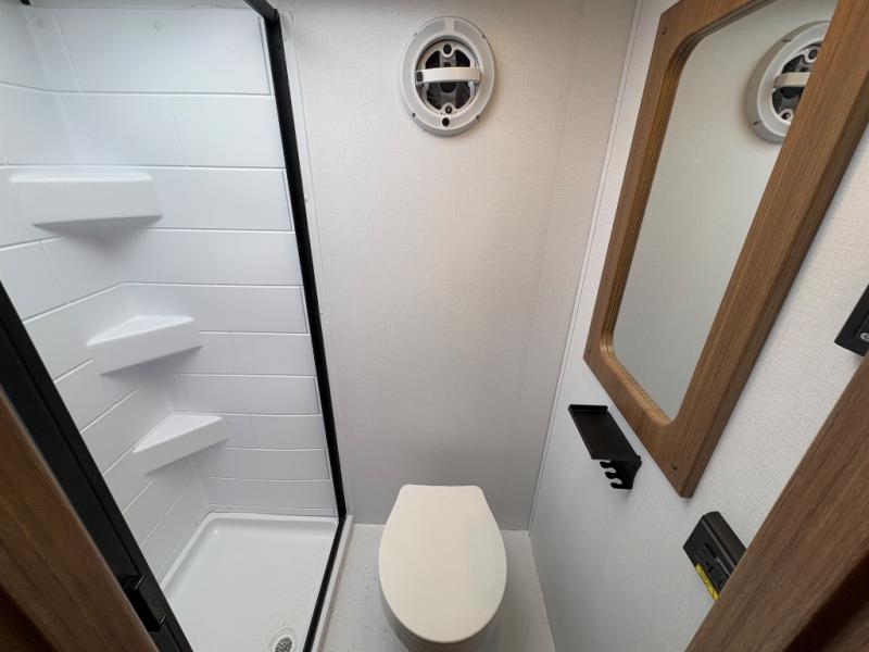 Prepare simple meals and store your perishables with ease thanks to the compact refrigerator and solid surface countertops. When it's time to freshen up, enjoy the privacy and convenience of a full rear bathroom complete with a foot flush toilet and shower. Whether you’re parked at a scenic lake or a bustling RV park, the 9' power awning creates a shaded outdoor living space perfect for relaxing in any weather.