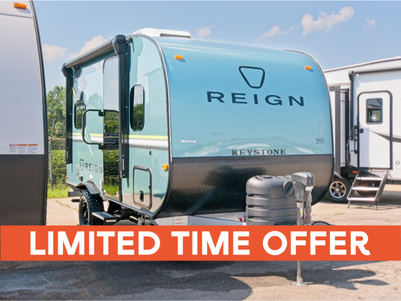 The Keystone Reign travel trailers are premium single-axle units designed to impress at any campground. Built with an exclusive automotive-finished aluminum exterior, a walkable roof, and a 100% composite floor, these trailers are both durable and stylish. Features include tinted safety glass windows, quick drop stabilizer jacks, and an exterior shower with hot and cold water.