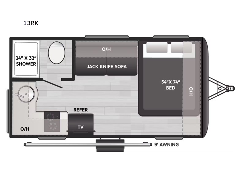 This travel trailer is ideal for weekend getaways or extended road trips! The full bathroom provides all the amenities you need, while the spacious 54" X 74" bed ensures a restful night's sleep. Moreover, overhead cabinets offer ample storage for your belongings, and the TV provides entertainment for downtime. The refrigerator keeps your favorite snacks and drinks fresh, and additional overhead cabinets offer extra storage. In addition, the 9' awning provides shade and protection from the elements, creating a comfortable outdoor living space.