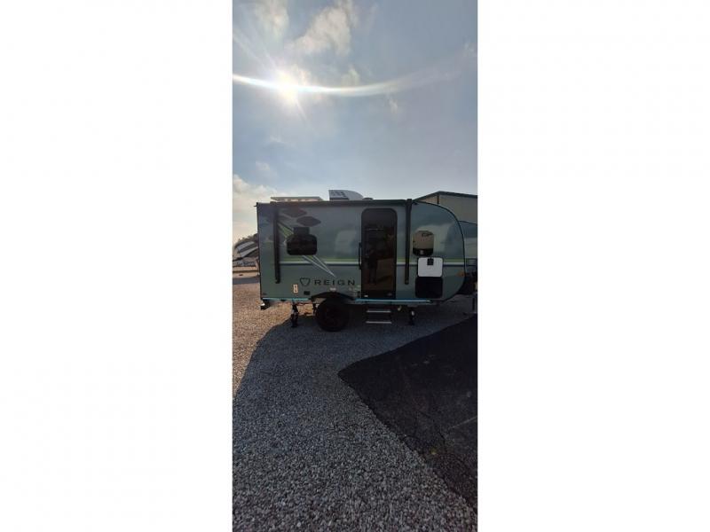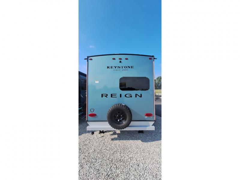 The Reign travel trailers by Keystone are premium single-axle units that are sure to make an impression at the campground. Each one is built with an exclusive automotive-finished aluminum exterior, a walkable roof, and a 100% composite floor for added durability. There are also tinted safety glass windows, quick drop stabilizer jacks, and an exterior shower with hot and cold water. The European inspired interior design is unique and cozy, and the 78" interior height will give you plenty of space to move about. You will also enjoy the ultra bright LED light strip and solid surface countertops in the kitchen, along with blackout night shades, and many more interior comforts.