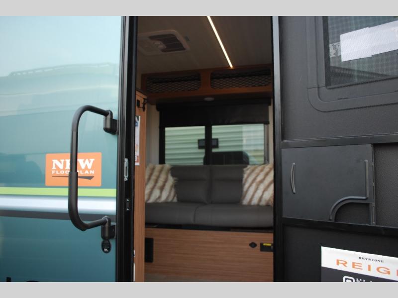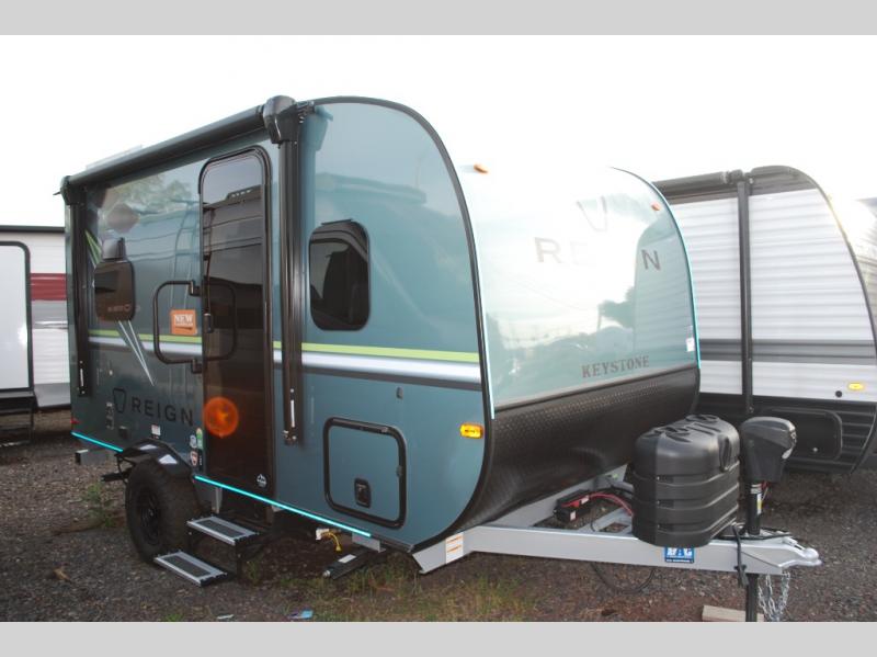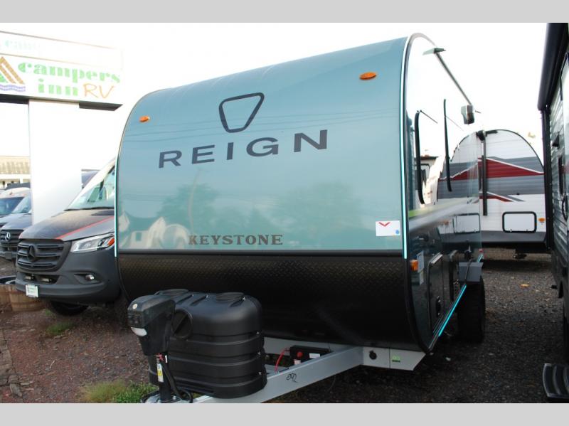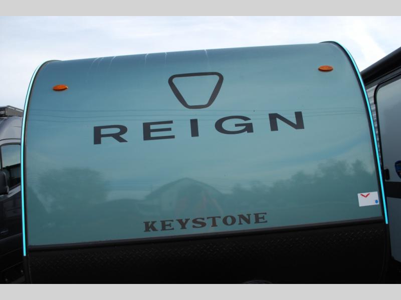 The Reign travel trailers by Keystone are premium single-axle units that are sure to make an impression at the campground. Each one is built with an exclusive automotive-finished aluminum exterior, a walkable roof, and a 100% composite floor for added durability. There are also tinted safety glass windows, quick drop stabilizer jacks, and an exterior shower with hot and cold water. The European inspired interior design is unique and cozy, and the 78" interior height will give you plenty of space to move about. You will also enjoy the ultra bright LED light strip and solid surface countertops in the kitchen, along with blackout night shades, and many more interior comforts.