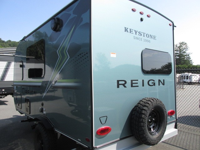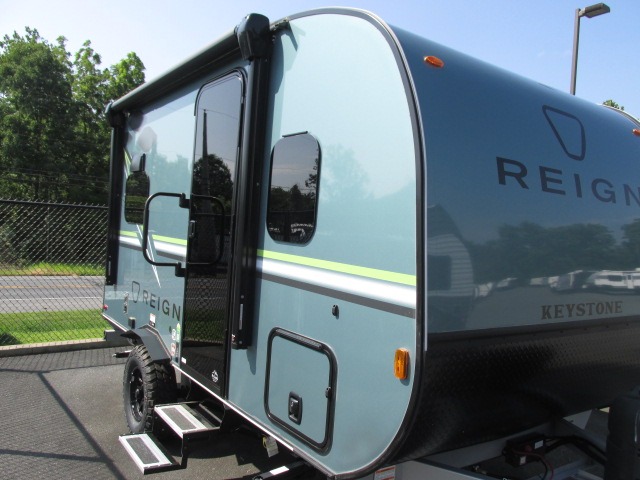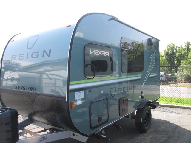 The Reign travel trailers by Keystone are premium single-axle units that are sure to make an impression at the campground. Each one is built with an exclusive automotive-finished aluminum exterior, a walkable roof, and a 100% composite floor for added durability. There are also tinted safety glass windows, quick drop stabilizer jacks, and an exterior shower with hot and cold water. The European inspired interior design is unique and cozy, and the 78" interior height will give you plenty of space to move about. You will also enjoy the ultra bright LED light strip and solid surface countertops in the kitchen, along with blackout night shades, and many more interior comforts.