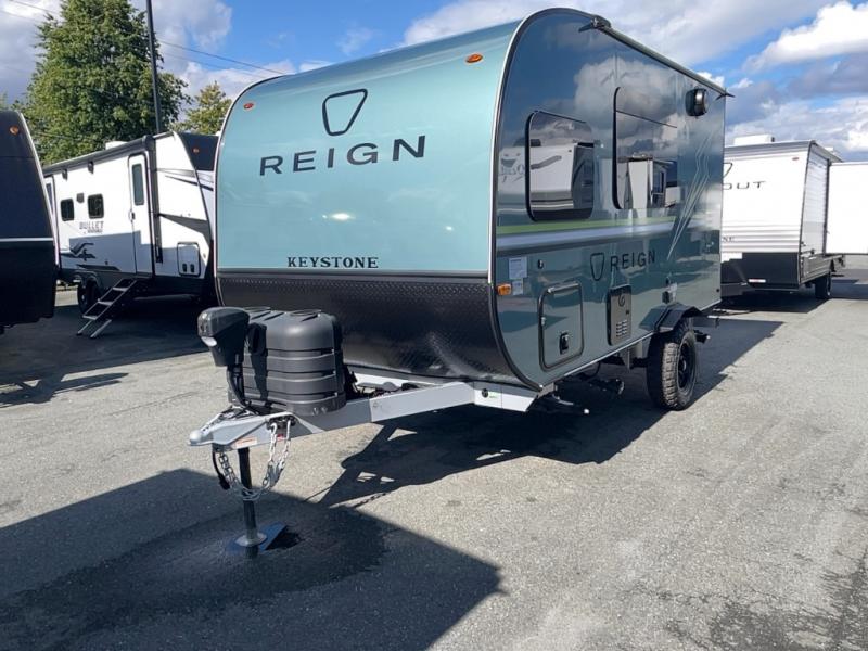 The Reign travel trailers by Keystone are premium single-axle units that are sure to make an impression at the campground. Each one is built with an exclusive automotive-finished aluminum exterior, a walkable roof, and a 100% composite floor for added durability. There are also tinted safety glass windows, quick drop stabilizer jacks, and an exterior shower with hot and cold water. The European inspired interior design is unique and cozy, and the 78" interior height will give you plenty of space to move about. You will also enjoy the ultra bright LED light strip and solid surface countertops in the kitchen, along with blackout night shades, and many more interior comforts.