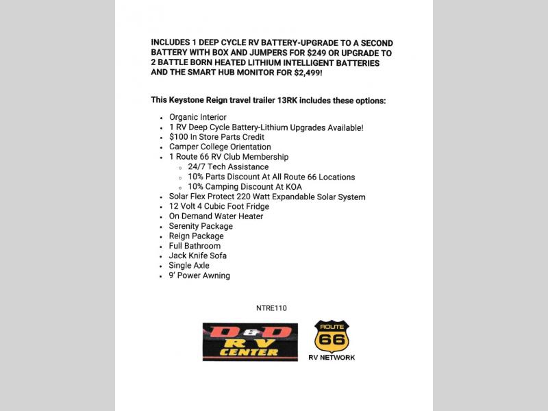 This Keystone Reign travel trailer 13RK includes these options: