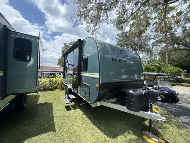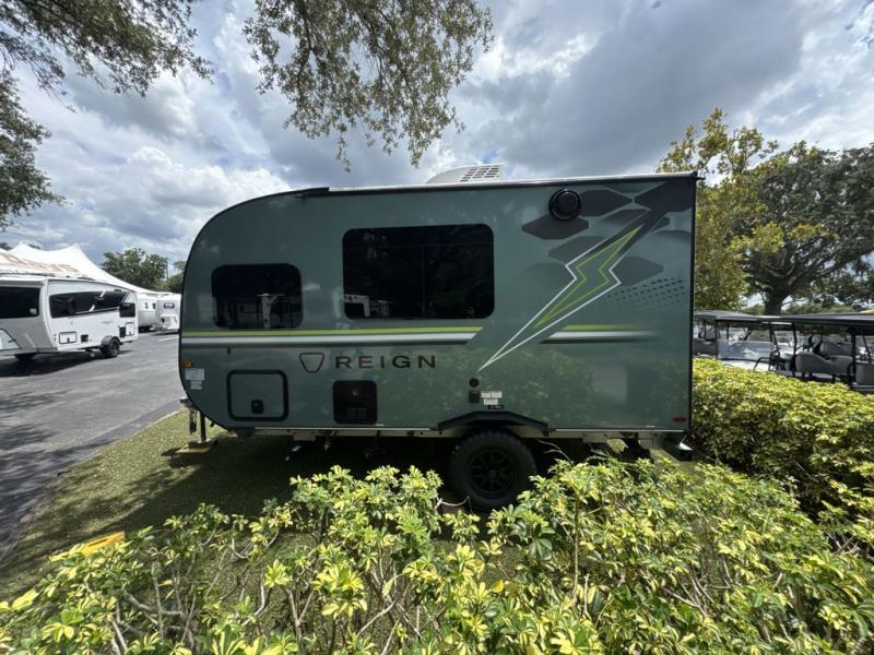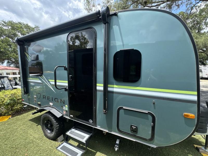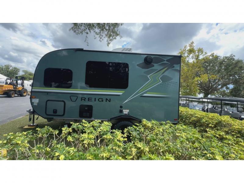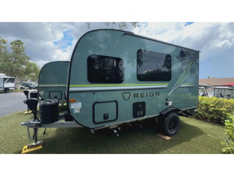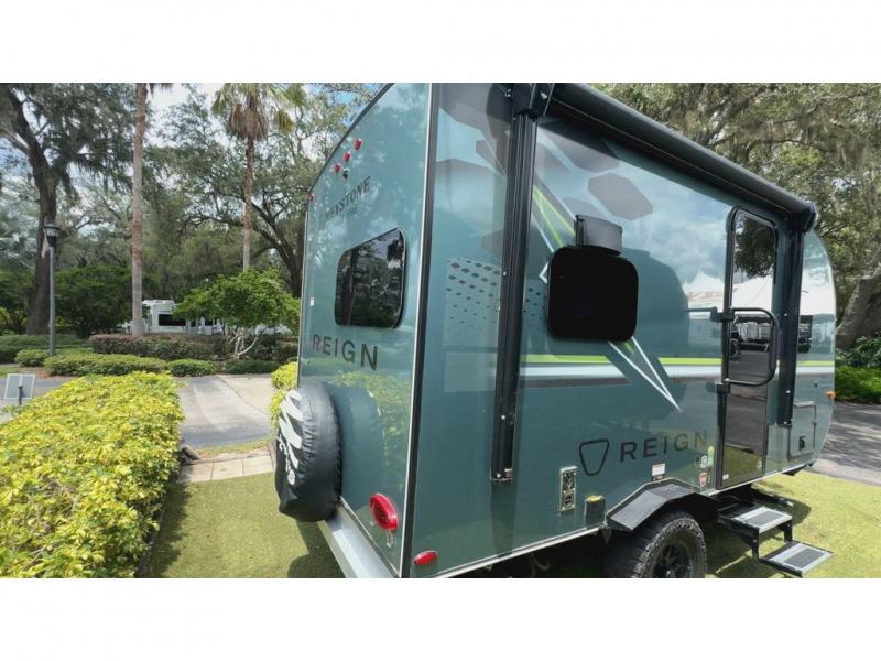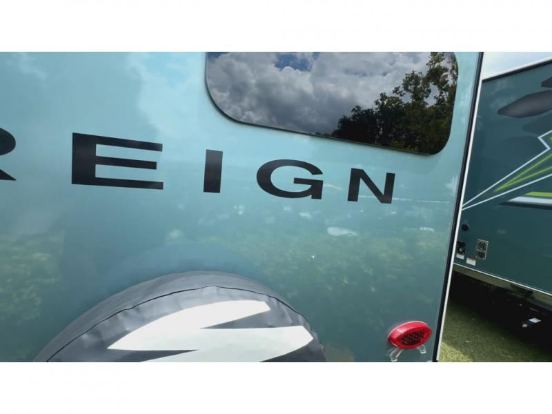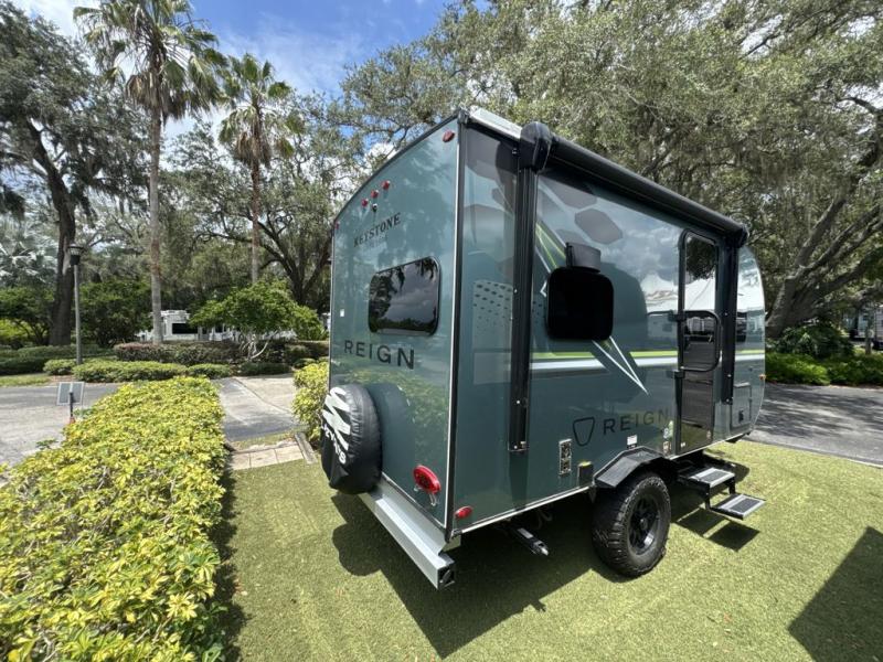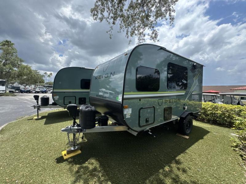 The Reign travel trailers by Keystone are premium single-axle units that are sure to make an impression at the campground. Each one is built with an exclusive automotive-finished aluminum exterior, a walkable roof, and a 100% composite floor for added durability. There are also tinted safety glass windows, quick drop stabilizer jacks, and an exterior shower with hot and cold water. The European inspired interior design is unique and cozy, and the 78" interior height will give you plenty of space to move about. You will also enjoy the ultra bright LED light strip and solid surface countertops in the kitchen, along with blackout night shades, and many more interior comforts.