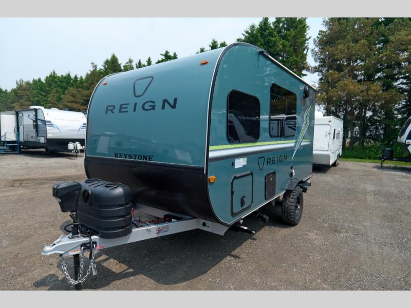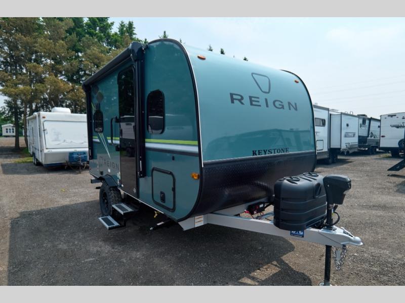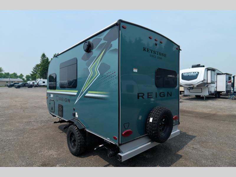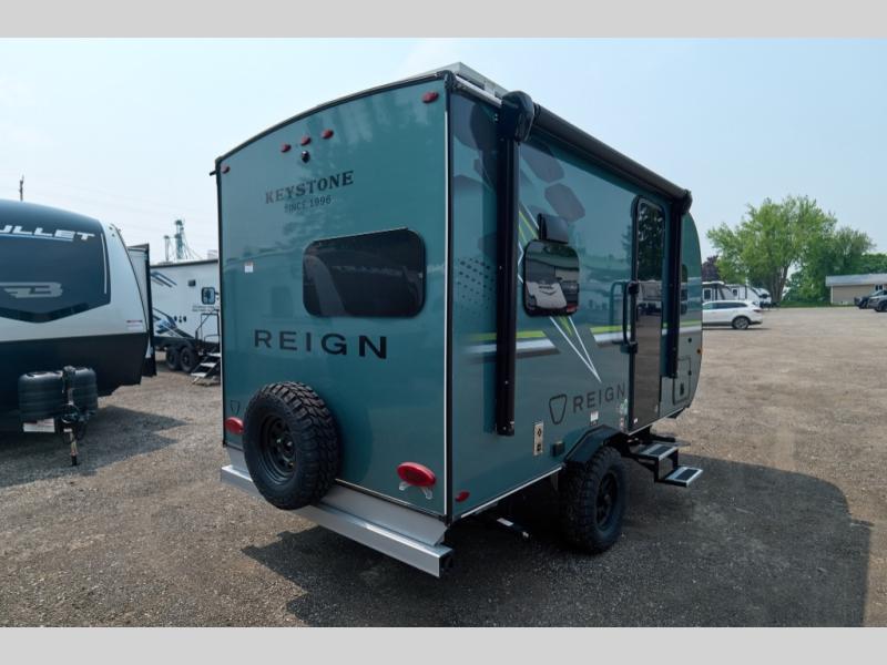 The Reign travel trailers by Keystone are premium single-axle units that are sure to make an impression at the campground. Each one is built with an exclusive automotive-finished aluminum exterior, a walkable roof, and a 100% composite floor for added durability. There are also tinted safety glass windows, quick drop stabilizer jacks, and an exterior shower with hot and cold water. The European inspired interior design is unique and cozy, and the 78" interior height will give you plenty of space to move about. You will also enjoy the ultra bright LED light strip and solid surface countertops in the kitchen, along with blackout night shades, and many more interior comforts.