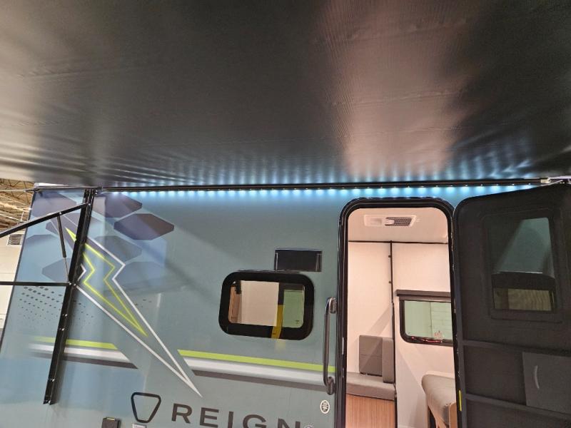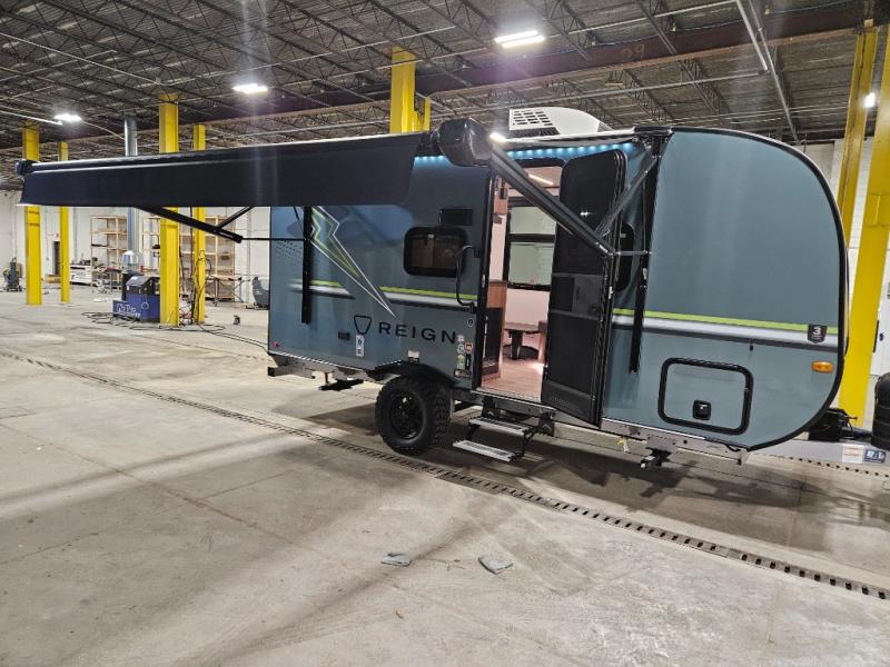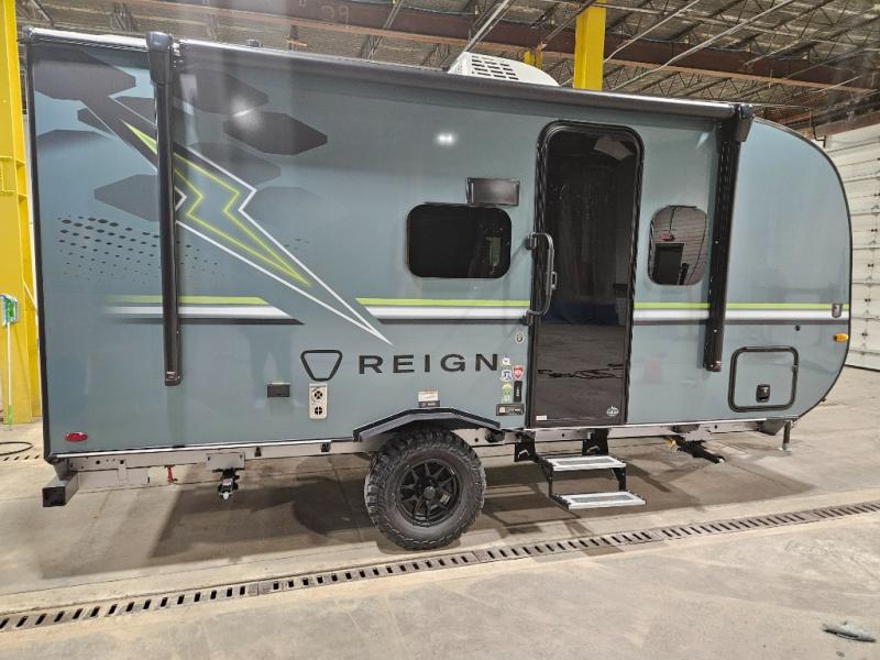 The Reign travel trailers by Keystone are premium single-axle units that are sure to make an impression at the campground. Each one is built with an exclusive automotive-finished aluminum exterior, a walkable roof, and a 100% composite floor for added durability. There are also tinted safety glass windows, quick drop stabilizer jacks, and an exterior shower with hot and cold water. The European inspired interior design is unique and cozy, and the 78" interior height will give you plenty of space to move about. You will also enjoy the ultra bright LED light strip and solid surface countertops in the kitchen, along with blackout night shades, and many more interior comforts.