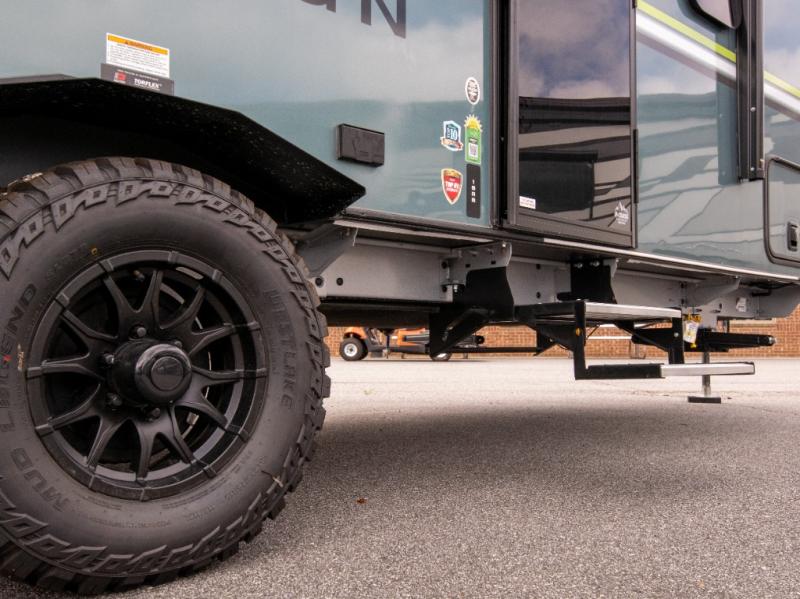 Built for Adventure, Crafted for Comfort Keystone’s Reign series stands out with a durable automotive-grade aluminum exterior, fully walkable roof, and a 100% composite floor—no wood, all confidence. Premium touches like tinted safety glass windows, quick-drop stabilizer jacks, and an exterior shower (hot & cold) cater to your every need.