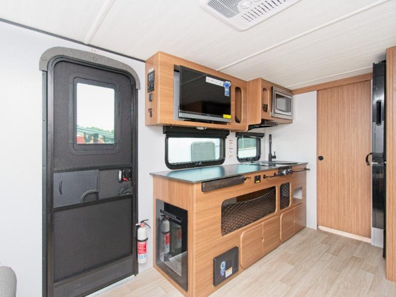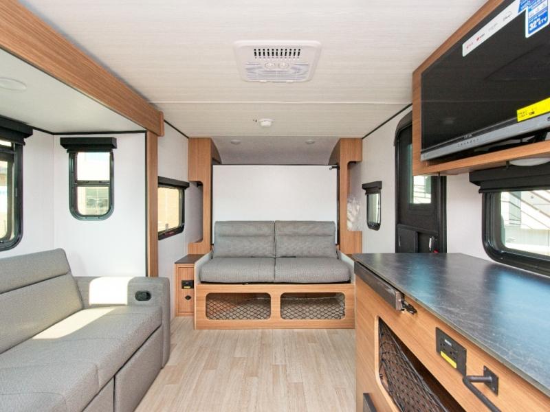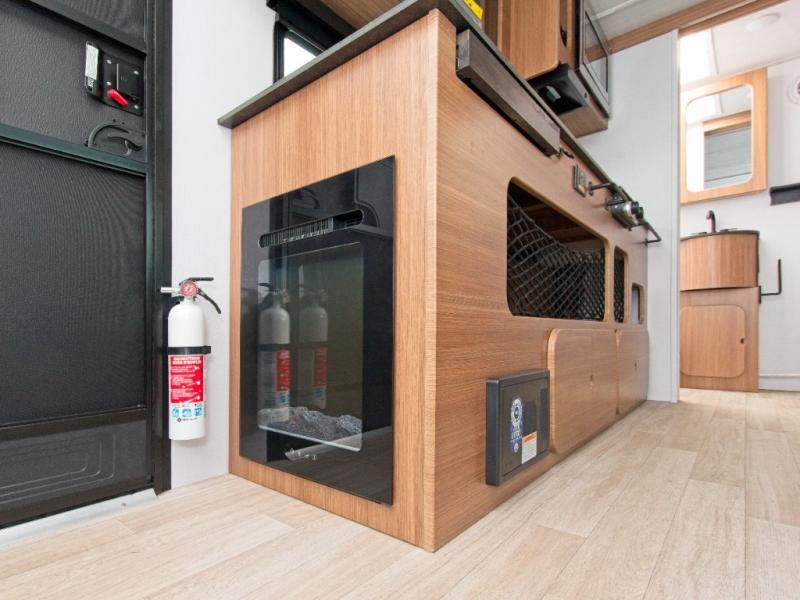 Cook like a pro on the two-burner cooktop or whip up quick meals with the built-in air fryer/convection microwave. The massive kitchen countertop and flip-up extension provide plenty of prep space. Wind down at the plush theater dinette by the cozy electric fireplace, making every trip feel like home.