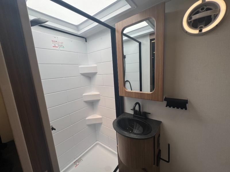 The spacious rear bathroom sets the Reign 18RB apart from other small travel trailers. It includes a large shower, vanity with storage, and a toilet, giving you a private and comfortable space to refresh after a day of adventure.