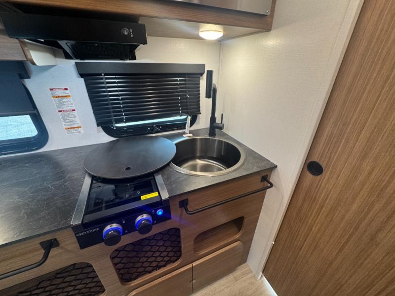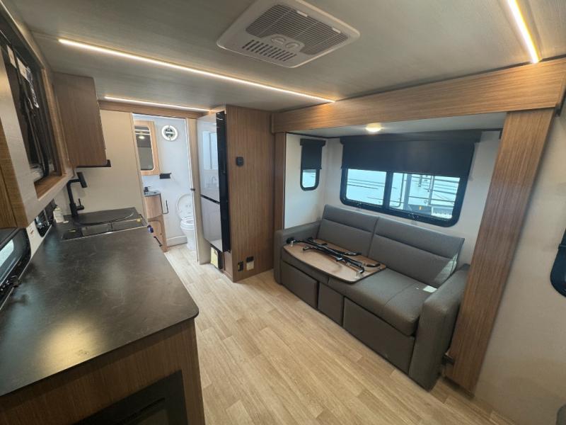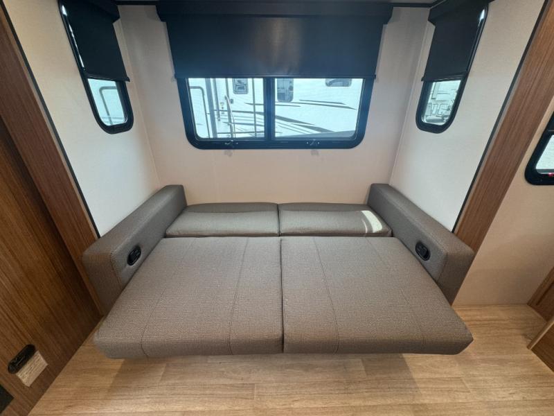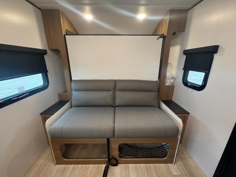 Despite its compact size, the Reign 18RB offers an open, functional layout that maximizes every inch of space. The cozy living area includes a booth dinette that converts to an additional sleeping area, ideal for guests. Large windows keep the interior bright and inviting, making this trailer feel like home on the road.