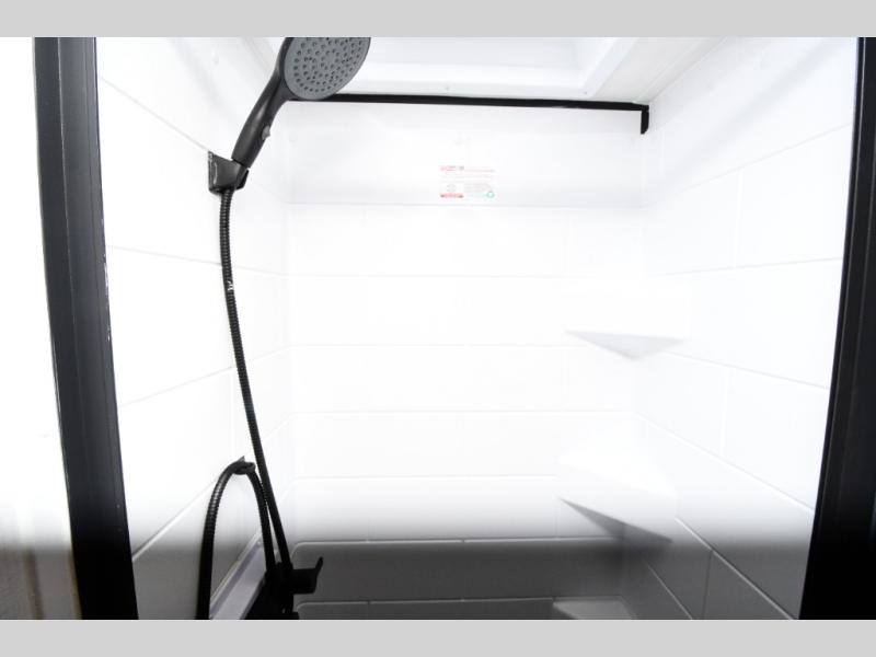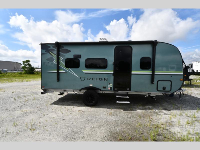 Designed for both comfort and convenience, the Reign 18RB comes with a front Murphy bed, 11' power awning, and an 11' interior height that makes the space feel open and inviting. The single-axle design ensures easy towing, while features like quick drop stabilizer jacks, exterior shower with hot and cold water, and tinted safety glass windows make campground life simple. With its European-inspired interior, solid surface countertops, ultra-bright LED lighting, and blackout night shades, this Reign travel trailer combines style, functionality, and durability in one smart package.
