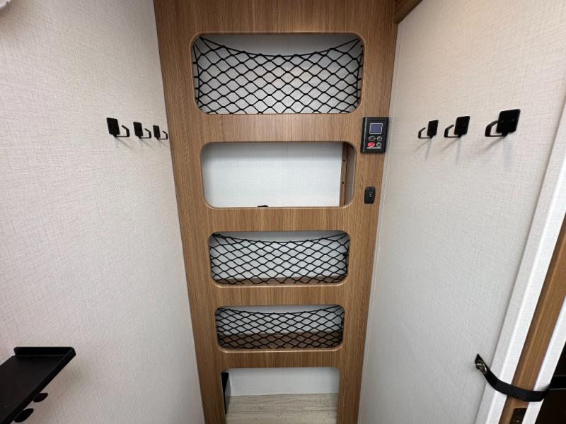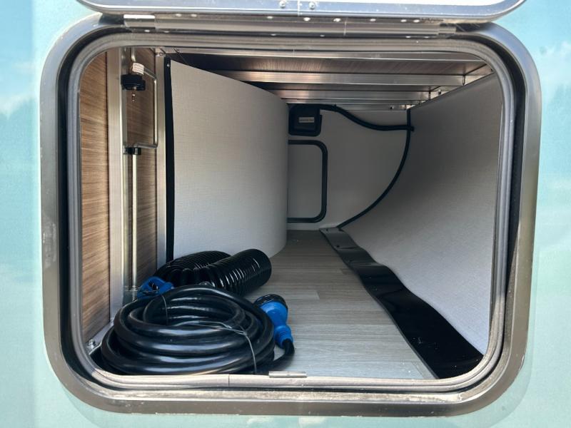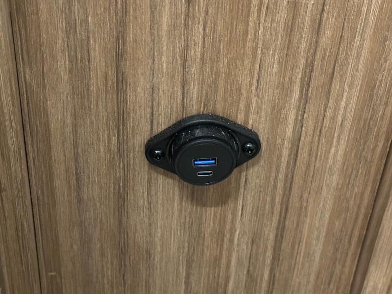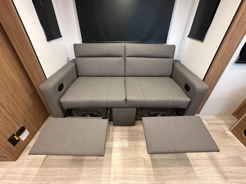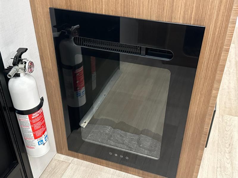 Standard exterior/interior amenities include tinted safety glass, electric fireplace, blackout shades, solid-surface countertops, theater seating, flip-up counter, dedicated trash storage, USB A+C ports, and color-coded wiring