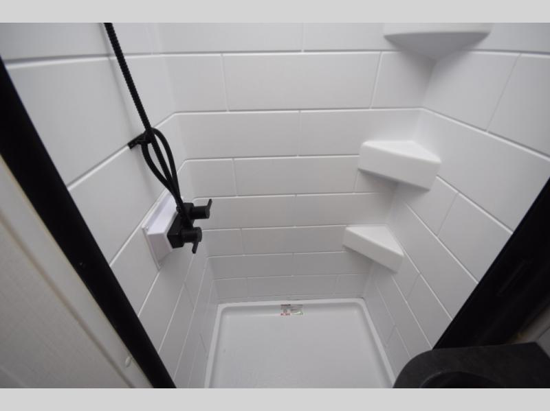 Comes equipped with tinted safety glass windows, quick-drop stabilizer jacks, and an exterior shower with hot and cold water for convenience on the go. -