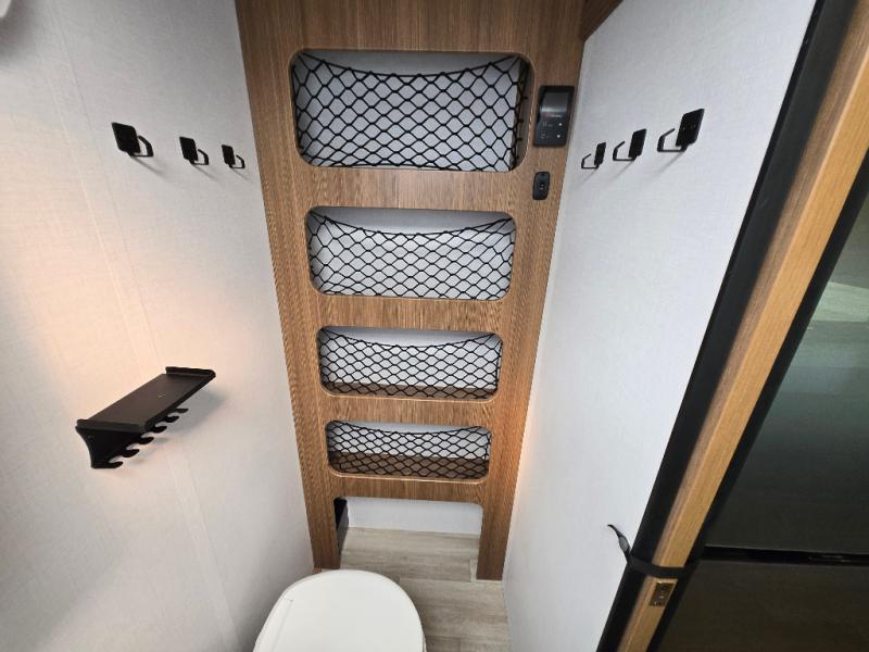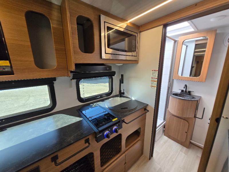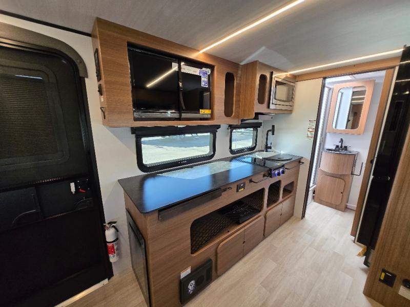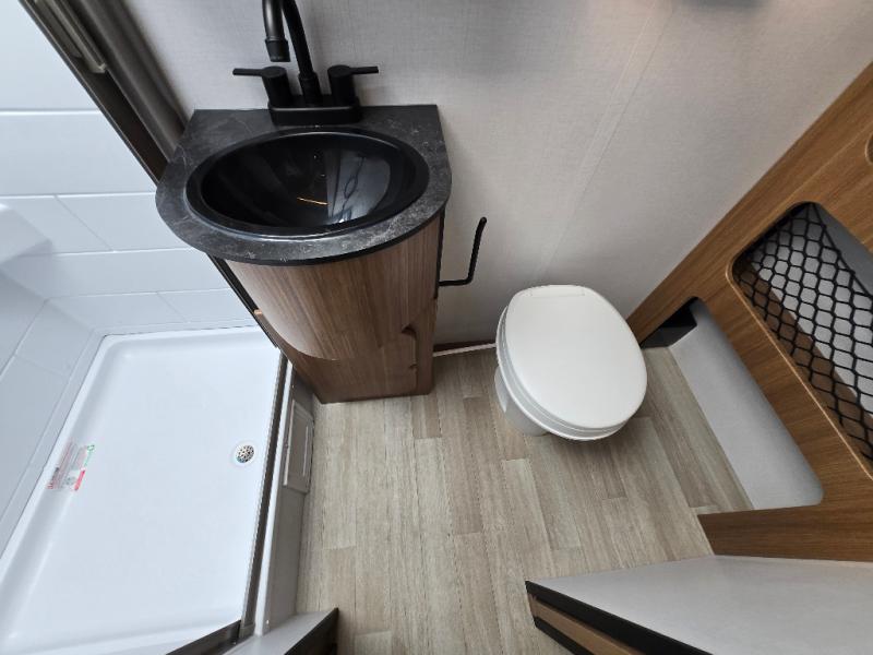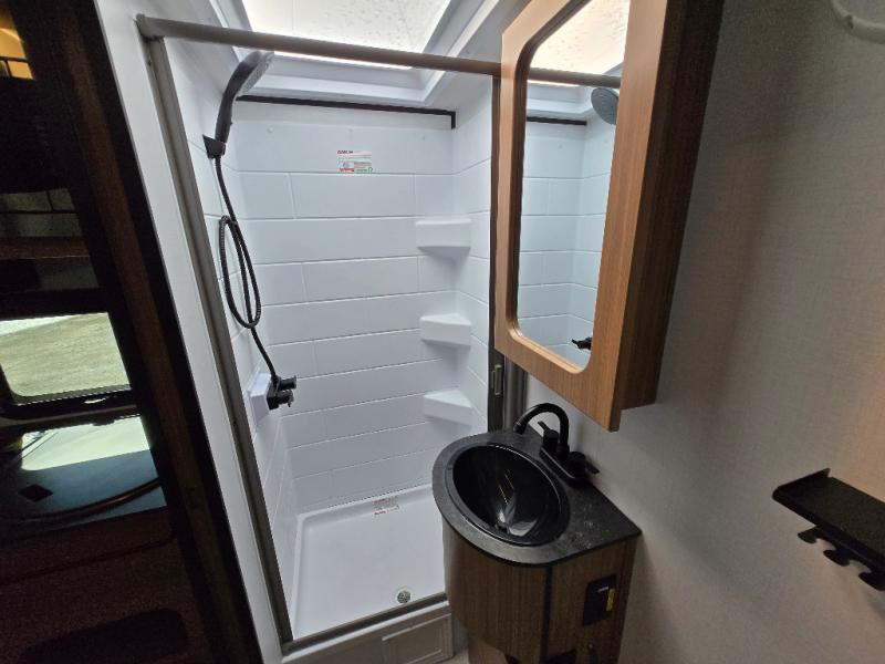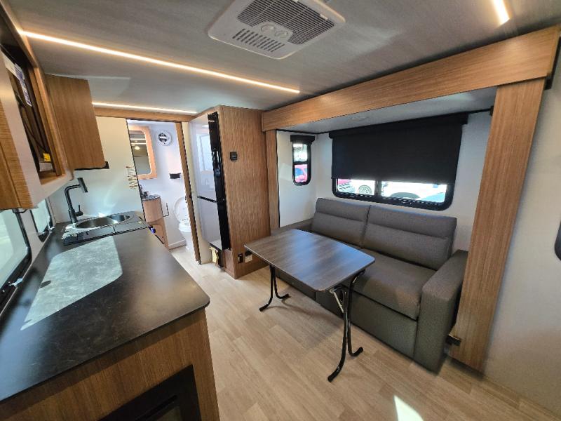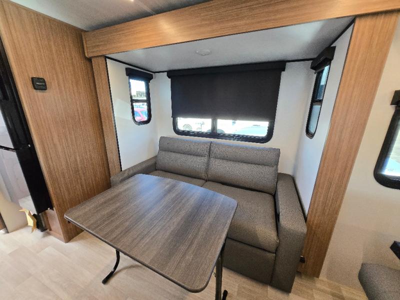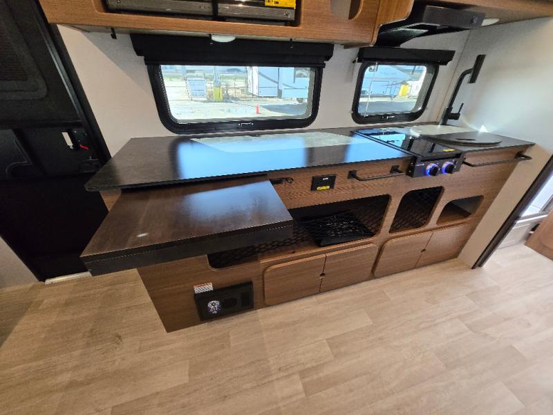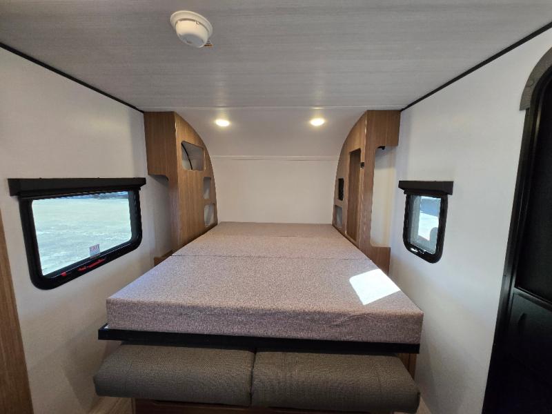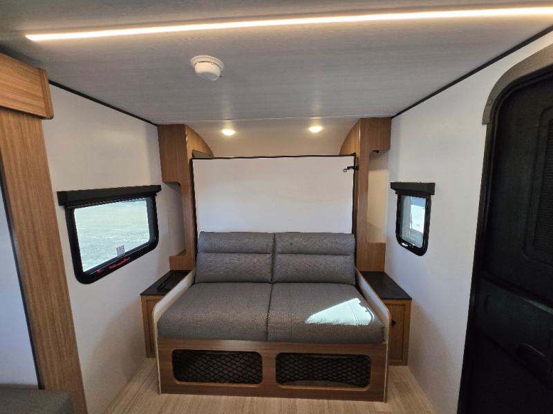 This single axle trailer is both cozy and versatile since there is a fold down sofa/Murphy bed up front! Now you can easily convert seating space into sleeping space, plus there are dual bedside closets to keep your things tidy. A two burner cooktop and air fryer/convection microwave will let you cook meals each day, and there is a huge countertop plus a flip-up extension for even more prep space. This unit also includes a theater dinette where you can relax each day, and the fireplace is sure to make your space feel like home!