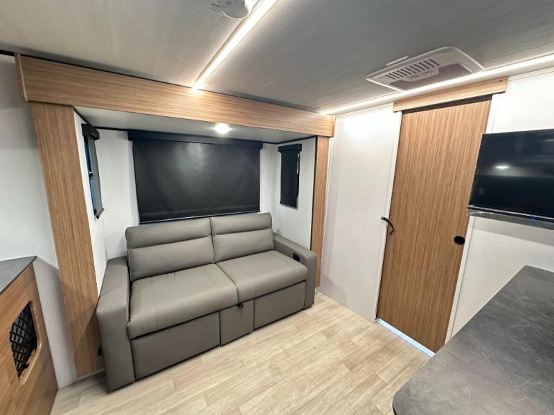 Rear Kitchen Layout — The kitchen is in the back (rear of the trailer), which often gives a more open feel inside with views out the rear windows.