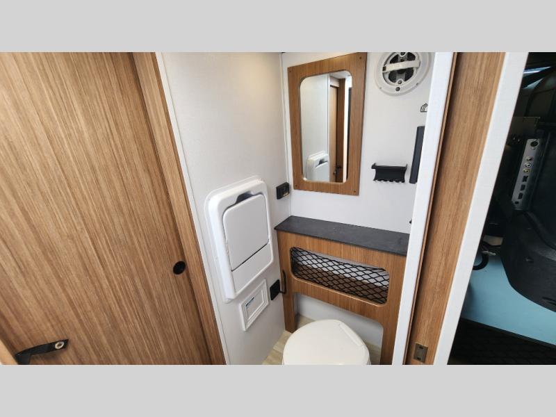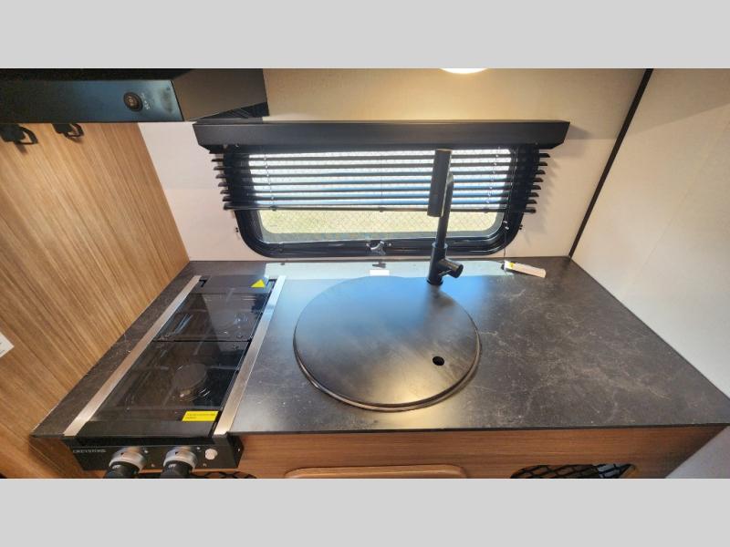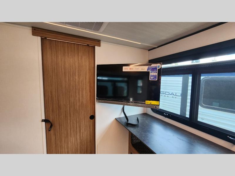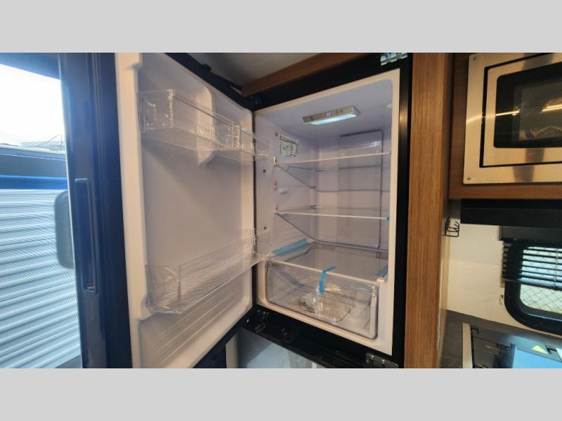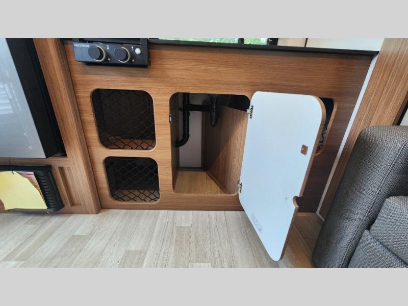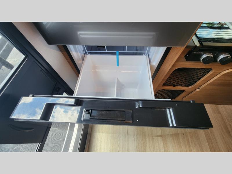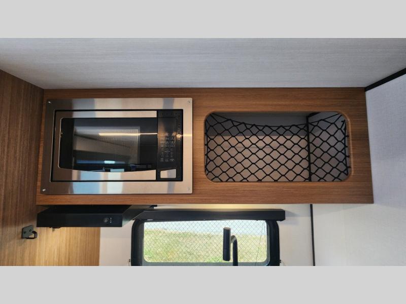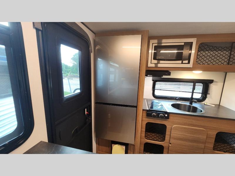 The efficient rear kitchen layout offers plenty of counter space, a deep stainless steel sink, 2-burner stove, microwave, and a large 10 cu. ft. 12V refrigerator. Whether you’re cooking campsite breakfasts or prepping trail snacks, everything is right where you need it.