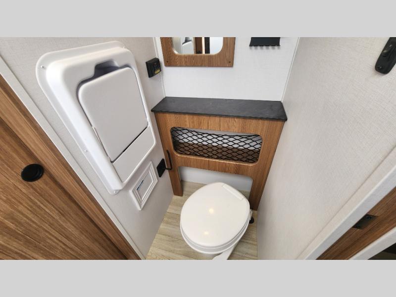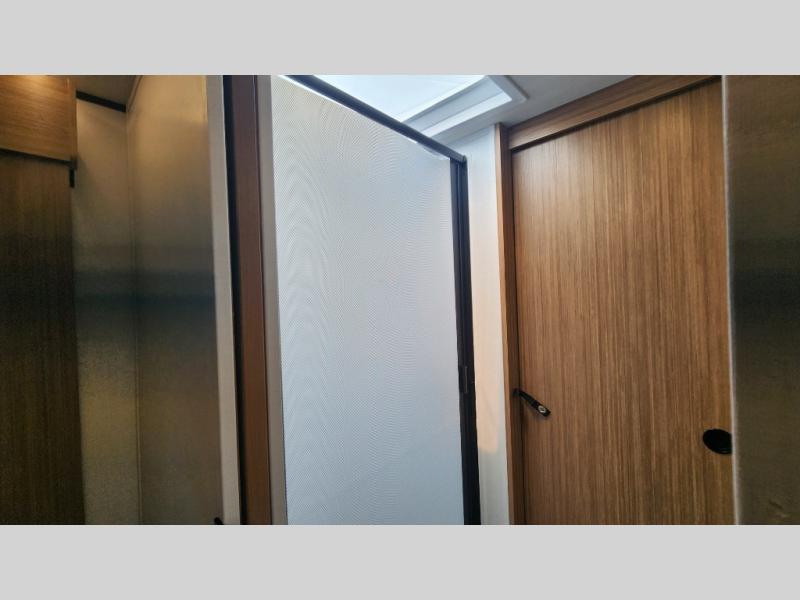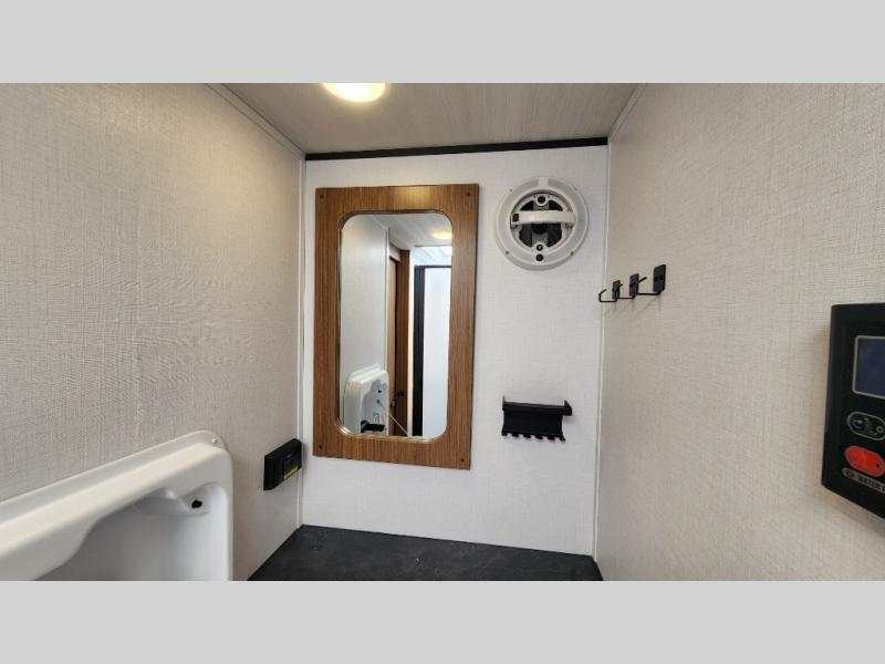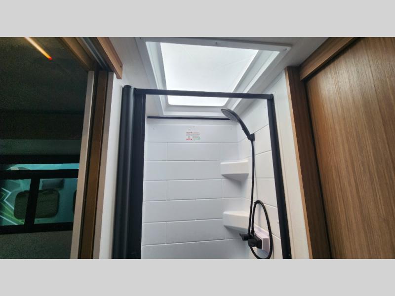 The full rear bath includes a foot-flush toilet, vanity sink, medicine cabinet, and a roomy walk-in shower with skylight, so you’ll never feel cramped, even in the great outdoors.