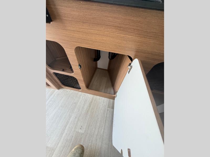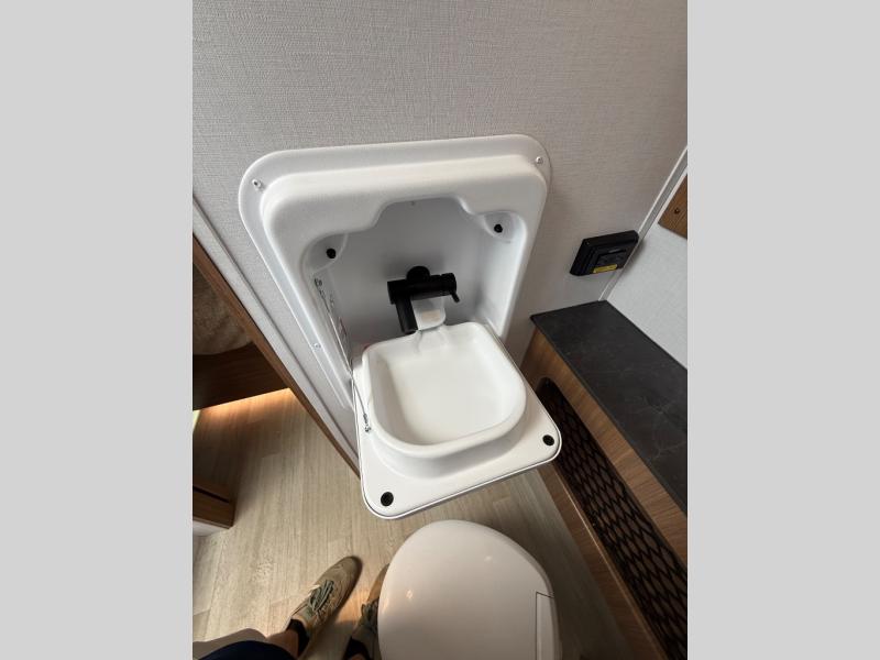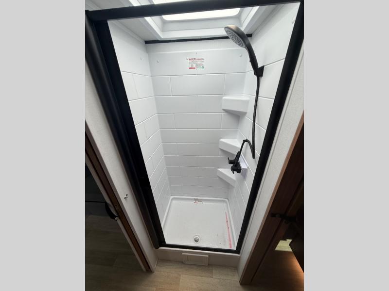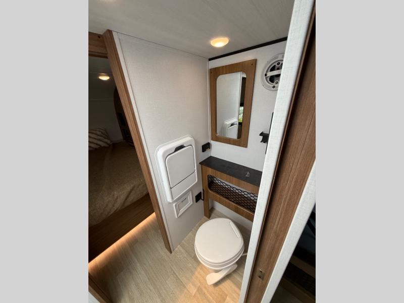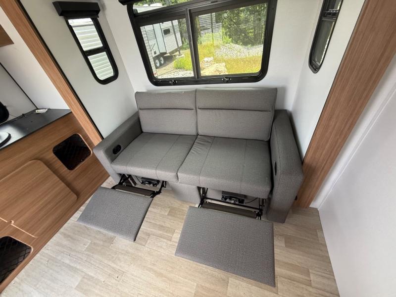 You will love this travel trailer's stunning rear kitchen design! The theater dinette provides a comfortable spot for meals and relaxation, while the bar countertop with stools offers a space for socializing and enjoying drinks. Also, overhead cabinets provide ample storage for your kitchen essentials. In the center of this travel trailer, the walkthrough bathroom features a convenient flip-down sink and linen closet, making it easy to get ready and stay organized. Moreover, the front bedroom is a serene retreat, featuring a spacious 60” x 74” bed with cubbies beside the bed for storing your favorite books, glasses, or other personal items. Plus, a 13' awning provides shade and protection from the elements, creating a comfortable outdoor living space.