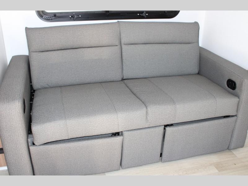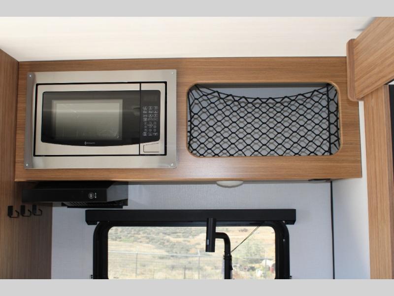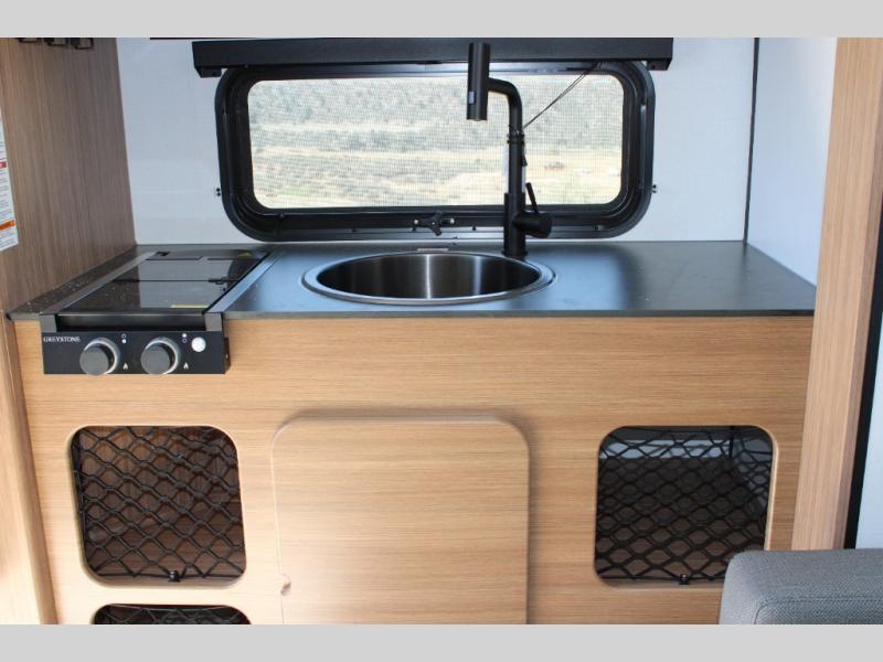 Rear Kitchen Layout: The thoughtfully designed rear kitchen offers ample counter space and storage, equipped with a two-burner cooktop, convection microwave, and a full-size 12V refrigerator, making meal preparation on the road both convenient and enjoyable.