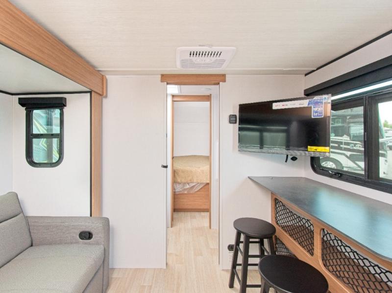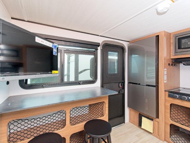 Experience the perfect blend of style, comfort, and functionality with the Keystone Reign 19RK Travel Trailer. Designed for travelers who value smart layouts and premium features, this single-axle unit offers a stunning rear kitchen complete with overhead cabinets and a sleek bar countertop with stools—ideal for entertaining or enjoying a quiet morning coffee.