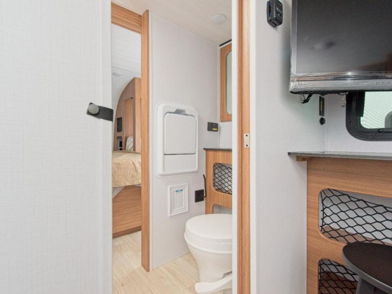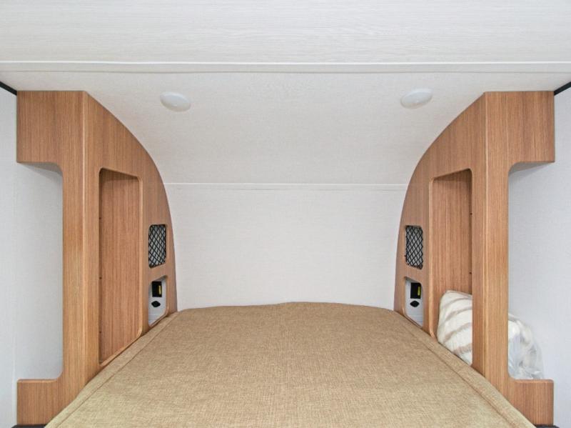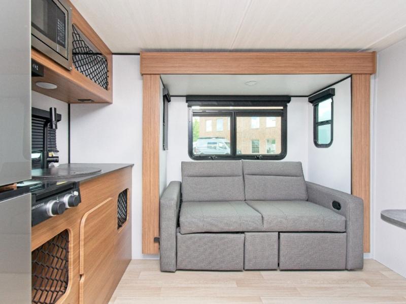 The theater dinette provides a cozy space for dining or relaxing, while the walk-through bathroom includes a flip-down sink and linen closet for added convenience and organization. At the front, you'll find a tranquil bedroom retreat featuring a spacious 60” x 74” bed and built-in cubbies—perfect for storing books, glasses, or personal items.