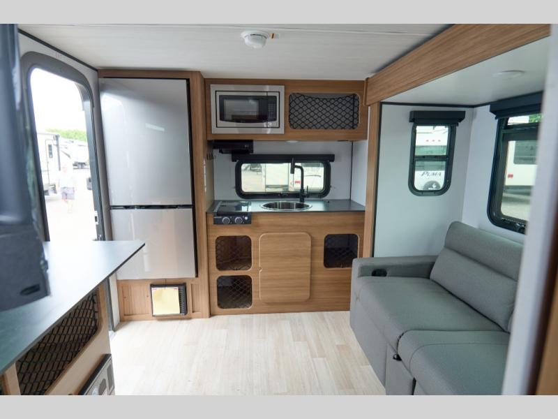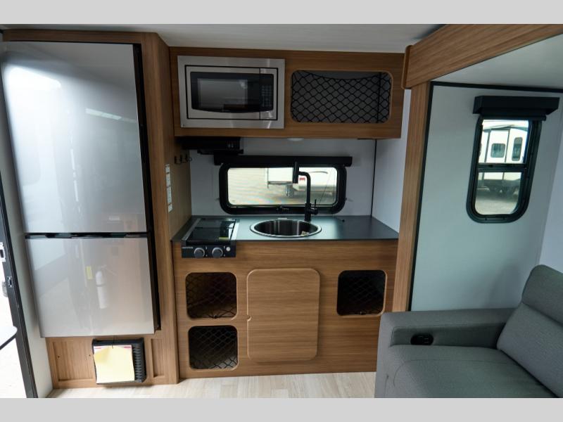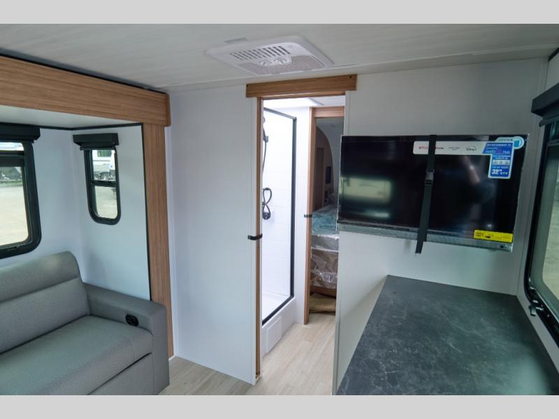 You will love this travel trailer's stunning rear kitchen design! The theater dinette provides a comfortable spot for meals and relaxation, while the bar countertop with stools offers a space for socializing and enjoying drinks. Also, overhead cabinets provide ample storage for your kitchen essentials. In the center of this travel trailer, the walkthrough bathroom features a convenient flip-down sink and linen closet, making it easy to get ready and stay organized. Moreover, the front bedroom is a serene retreat, featuring a spacious 60” x 74” bed with cubbies beside the bed for storing your favorite books, glasses, or other personal items. Plus, a 13' awning provides shade and protection from the elements, creating a comfortable outdoor living space.