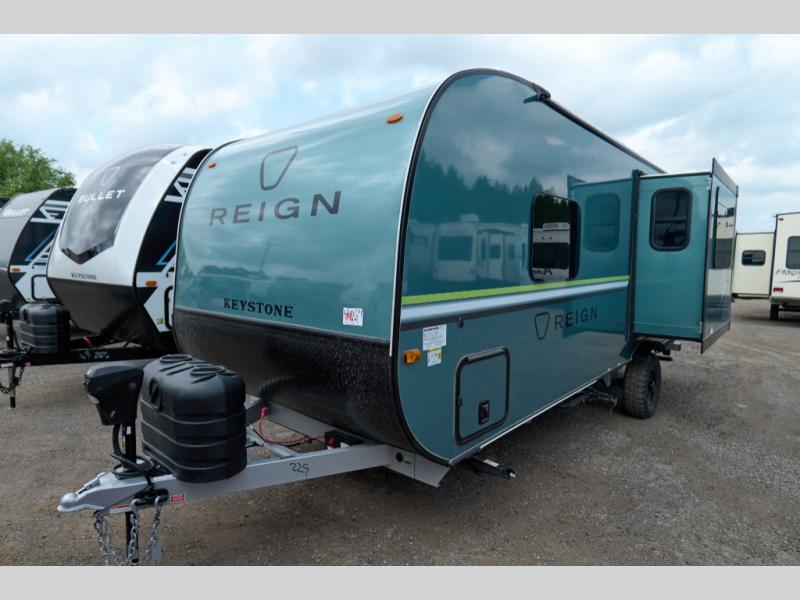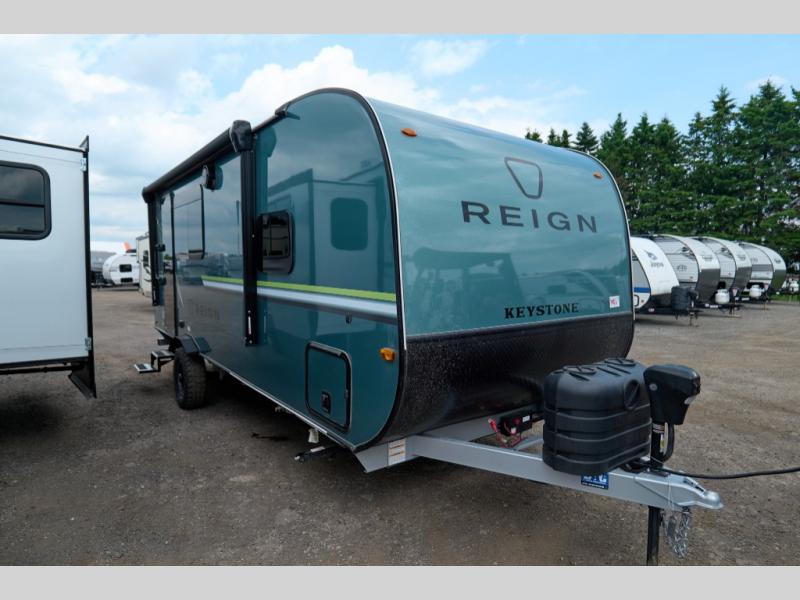 The Reign travel trailers by Keystone are premium single-axle units that are sure to make an impression at the campground. Each one is built with an exclusive automotive-finished aluminum exterior, a walkable roof, and a 100% composite floor for added durability. There are also tinted safety glass windows, quick drop stabilizer jacks, and an exterior shower with hot and cold water. The European inspired interior design is unique and cozy, and the 78" interior height will give you plenty of space to move about. You will also enjoy the ultra bright LED light strip and solid surface countertops in the kitchen, along with blackout night shades, and many more interior comforts.