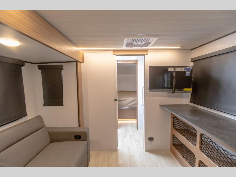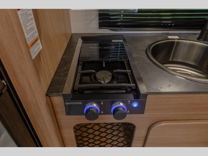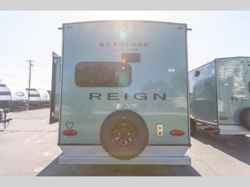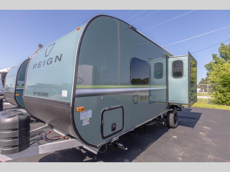 The Reign travel trailers by Keystone are premium single-axle units that are sure to make an impression at the campground. Each one is built with an exclusive automotive-finished aluminum exterior, a walkable roof, and a 100% composite floor for added durability. There are also tinted safety glass windows, quick drop stabilizer jacks, and an exterior shower with hot and cold water. The European inspired interior design is unique and cozy, and the 78" interior height will give you plenty of space to move about. You will also enjoy the ultra bright LED light strip and solid surface countertops in the kitchen, along with blackout night shades, and many more interior comforts.