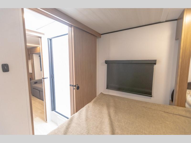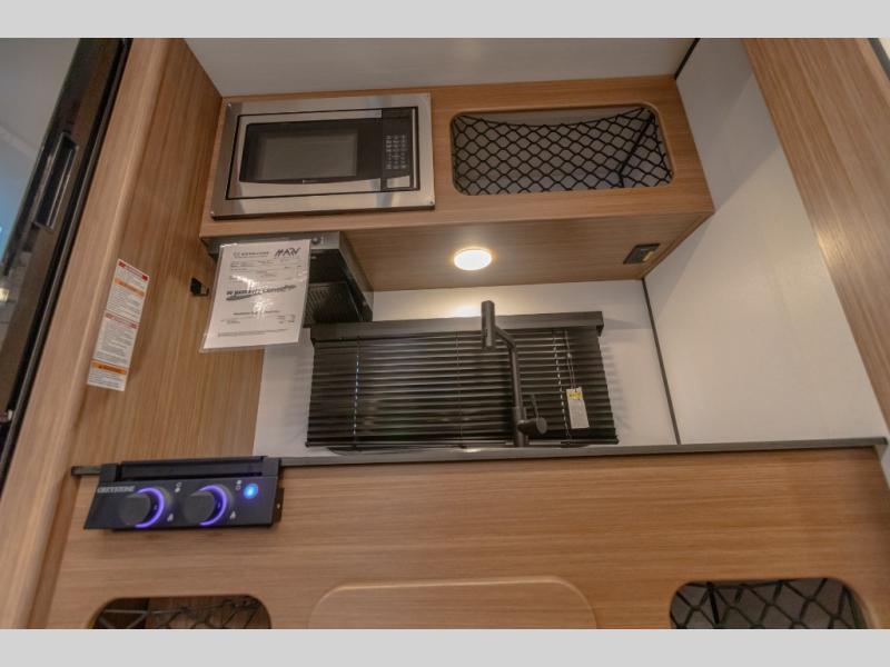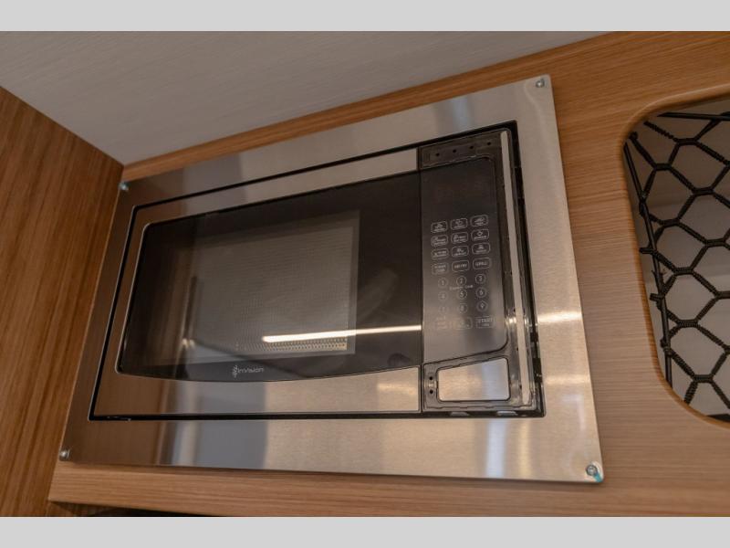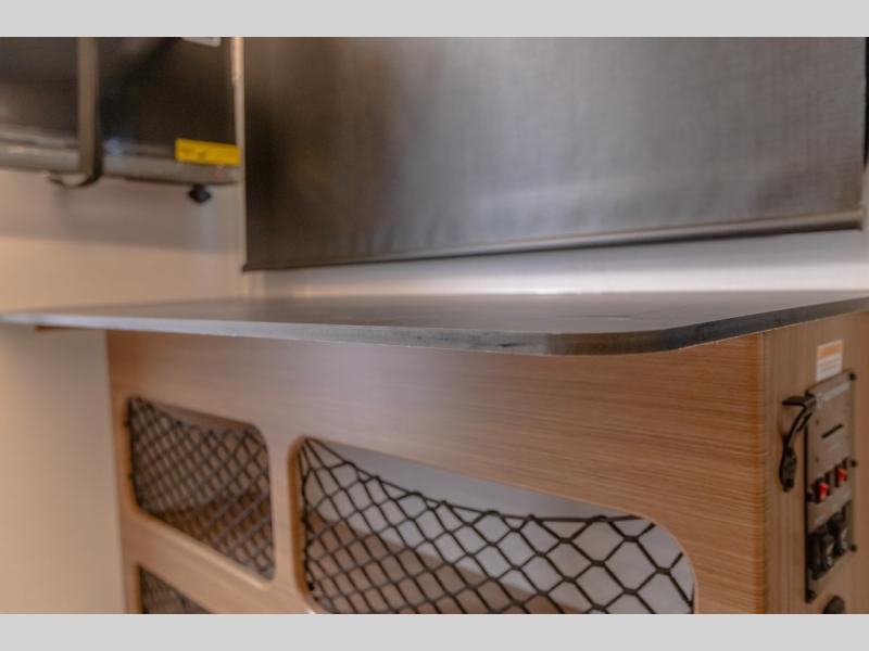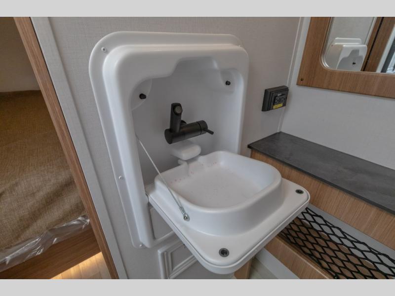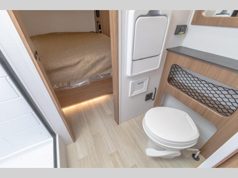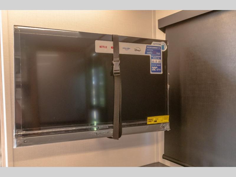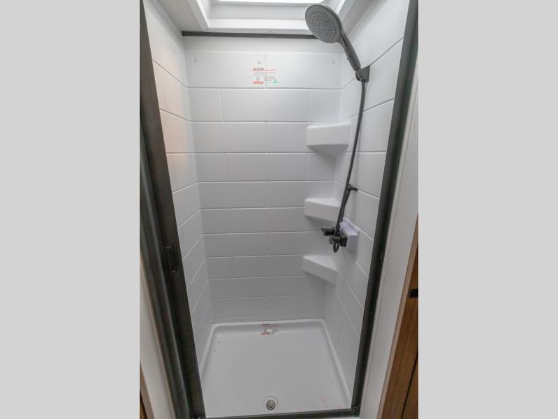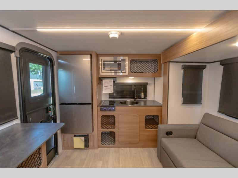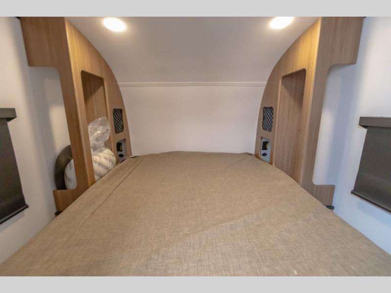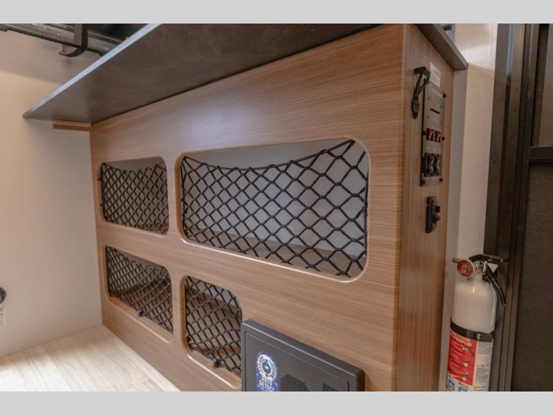 You will love this travel trailer's stunning rear kitchen design! The theater dinette provides a comfortable spot for meals and relaxation, while the bar countertop with stools offers a space for socializing and enjoying drinks. Also, overhead cabinets provide ample storage for your kitchen essentials. In the center of this travel trailer, the walkthrough bathroom features a convenient flip-down sink and linen closet, making it easy to get ready and stay organized. Moreover, the front bedroom is a serene retreat, featuring a spacious 60” x 74” bed with cubbies beside the bed for storing your favorite books, glasses, or other personal items. Plus, a 13' awning provides shade and protection from the elements, creating a comfortable outdoor living space.