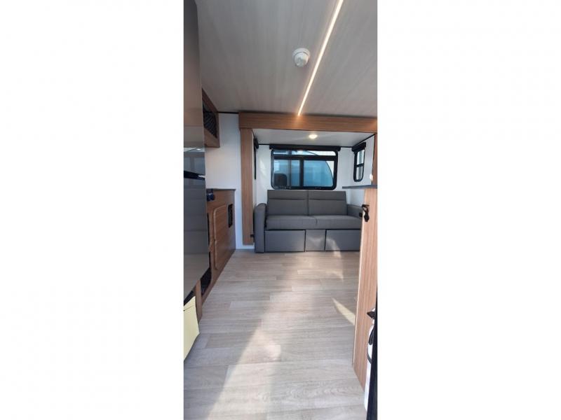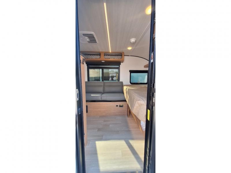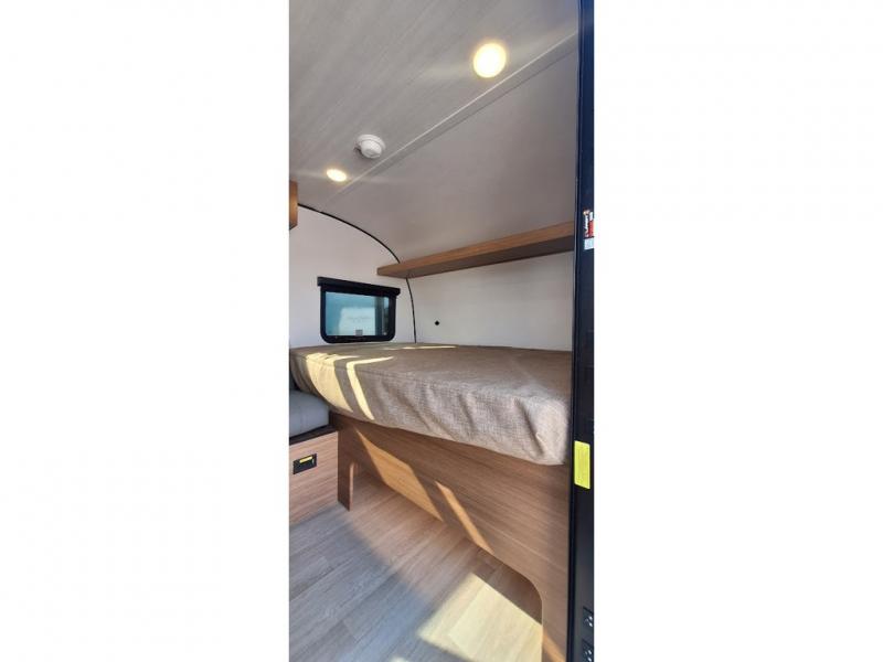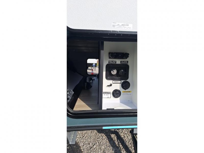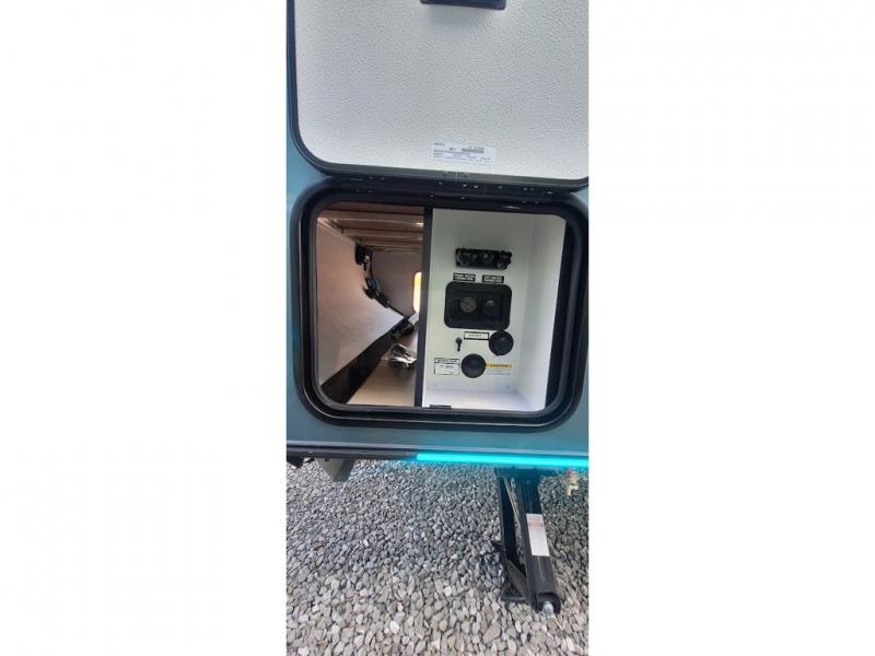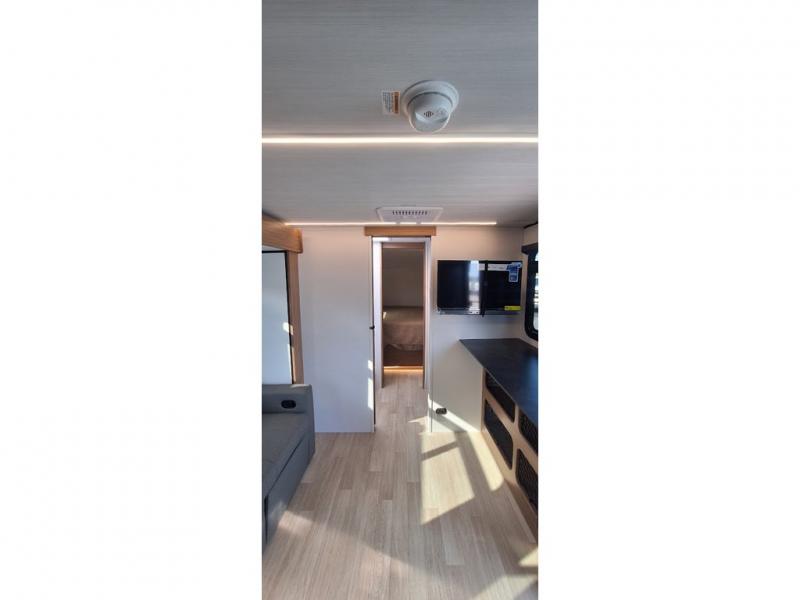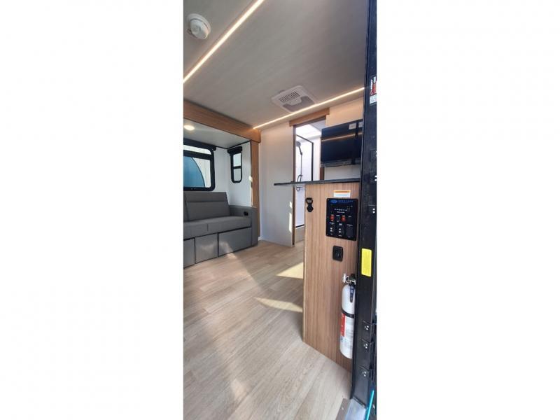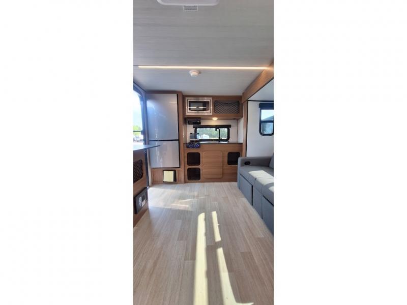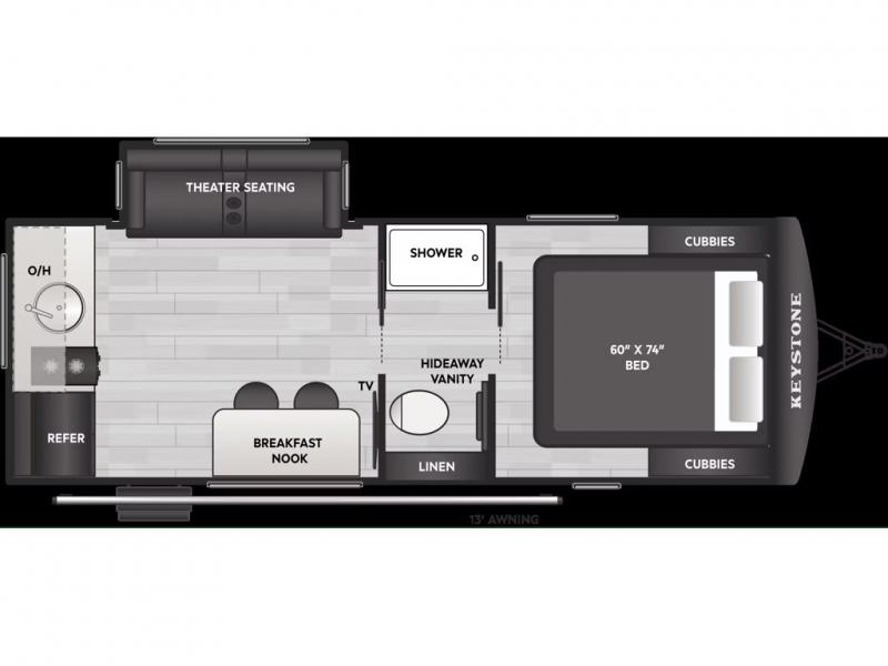 You will love this travel trailer's stunning rear kitchen design! The theater dinette provides a comfortable spot for meals and relaxation, while the bar countertop with stools offers a space for socializing and enjoying drinks. Also, overhead cabinets provide ample storage for your kitchen essentials. In the center of this travel trailer, the walkthrough bathroom features a convenient flip-down sink and linen closet, making it easy to get ready and stay organized. Moreover, the front bedroom is a serene retreat, featuring a spacious 60” x 74” bed with cubbies beside the bed for storing your favorite books, glasses, or other personal items. Plus, a 13' awning provides shade and protection from the elements, creating a comfortable outdoor living space.