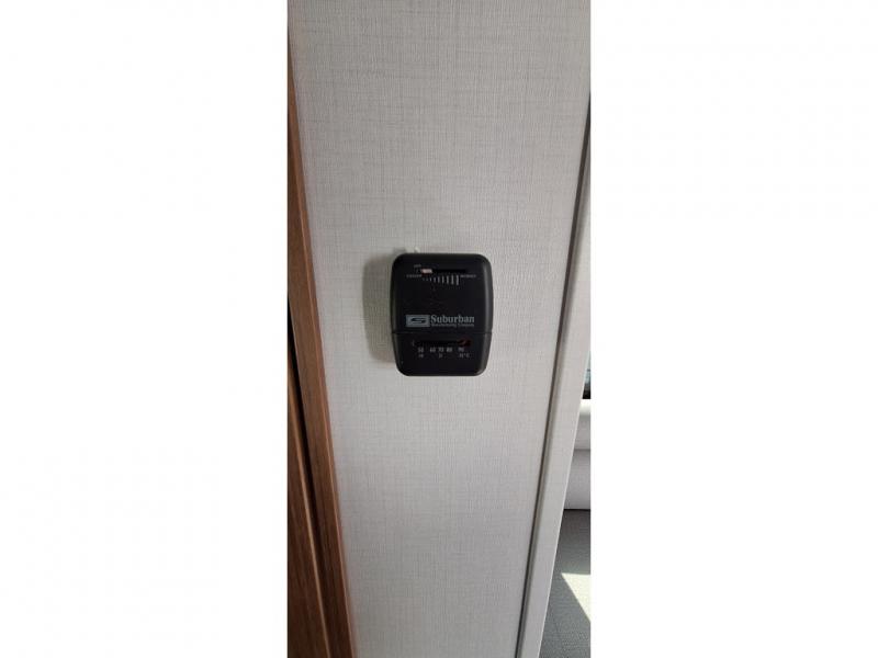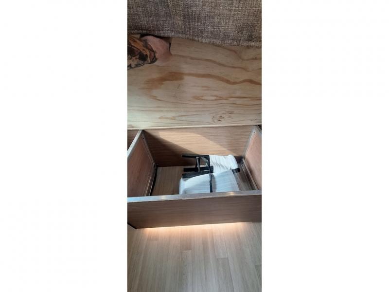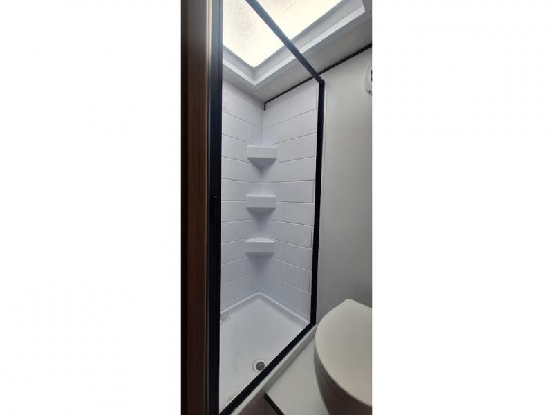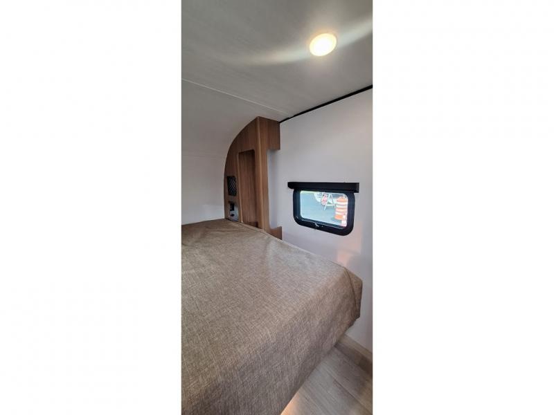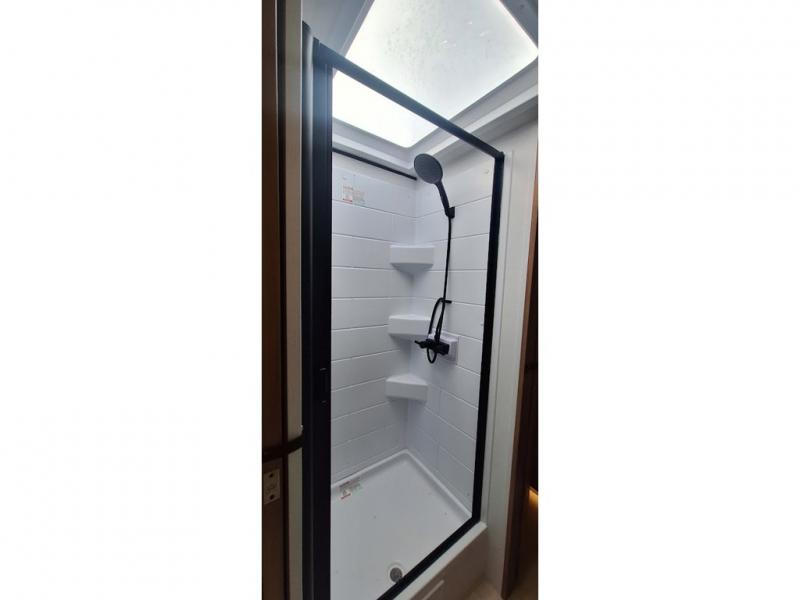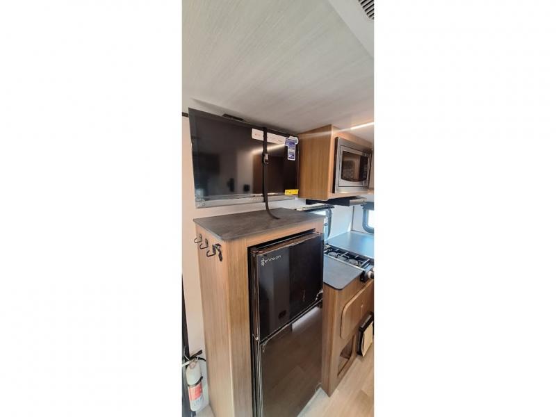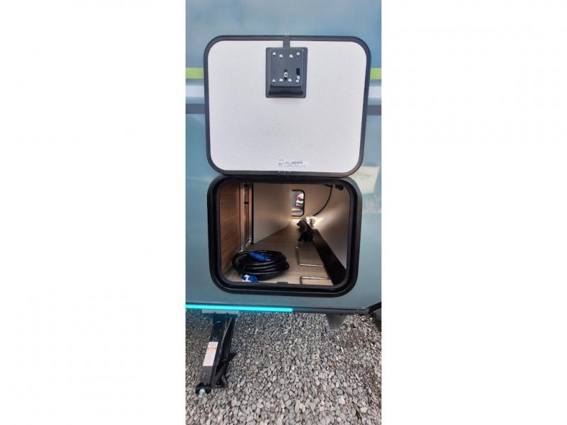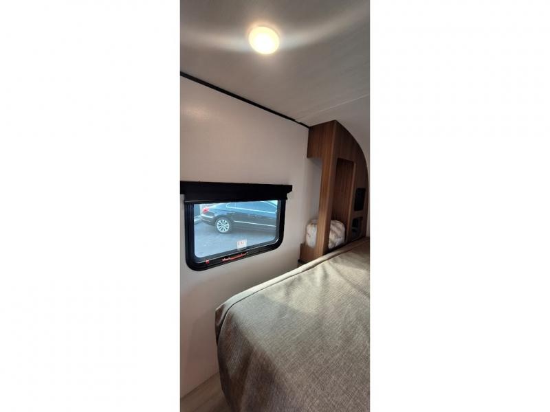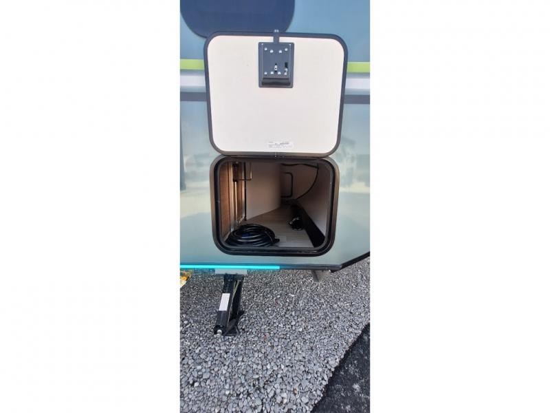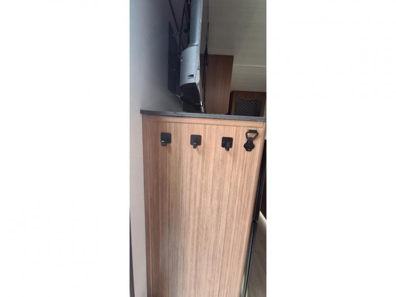 You will love this travel trailer's stunning rear kitchen design! The theater dinette provides a comfortable spot for meals and relaxation, while the bar countertop with stools offers a space for socializing and enjoying drinks. Also, overhead cabinets provide ample storage for your kitchen essentials. In the center of this travel trailer, the walkthrough bathroom features a convenient flip-down sink and linen closet, making it easy to get ready and stay organized. Moreover, the front bedroom is a serene retreat, featuring a spacious 60” x 74” bed with cubbies beside the bed for storing your favorite books, glasses, or other personal items. Plus, a 13' awning provides shade and protection from the elements, creating a comfortable outdoor living space.