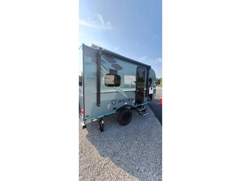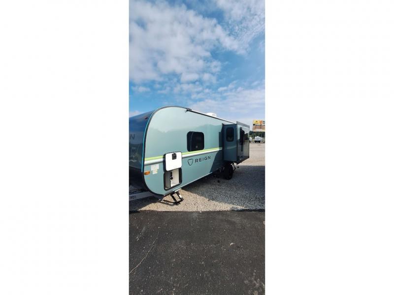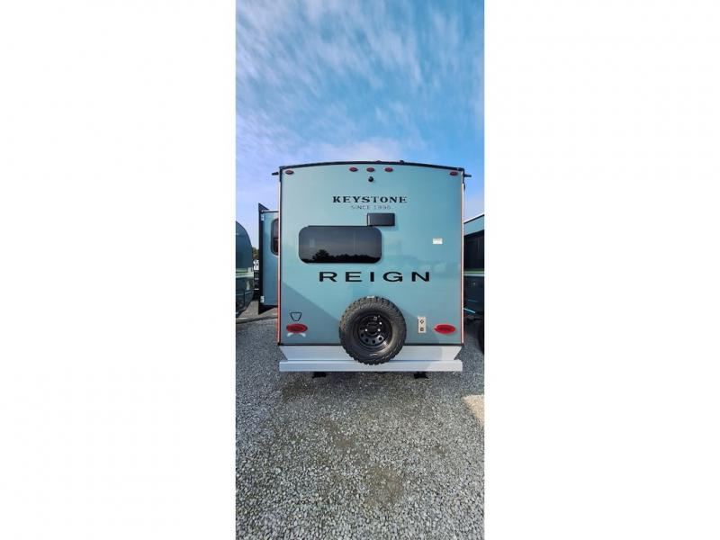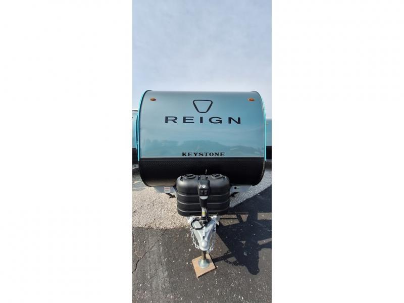The Reign travel trailers by Keystone are premium single-axle units that are sure to make an impression at the campground. Each one is built with an exclusive automotive-finished aluminum exterior, a walkable roof, and a 100% composite floor for added durability. There are also tinted safety glass windows, quick drop stabilizer jacks, and an exterior shower with hot and cold water. The European inspired interior design is unique and cozy, and the 78" interior height will give you plenty of space to move about. You will also enjoy the ultra bright LED light strip and solid surface countertops in the kitchen, along with blackout night shades, and many more interior comforts.