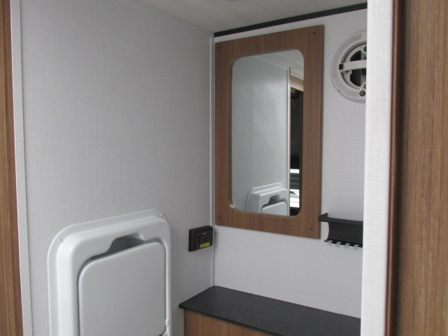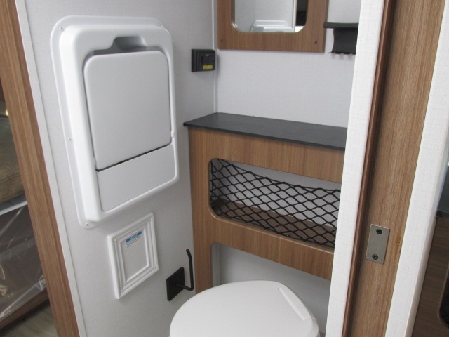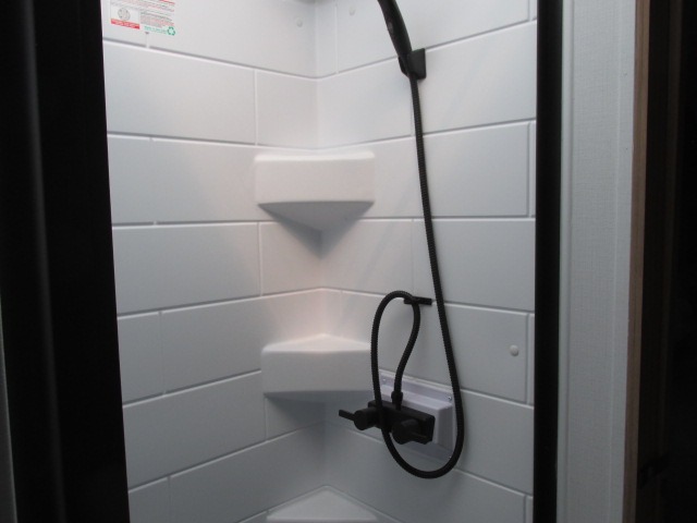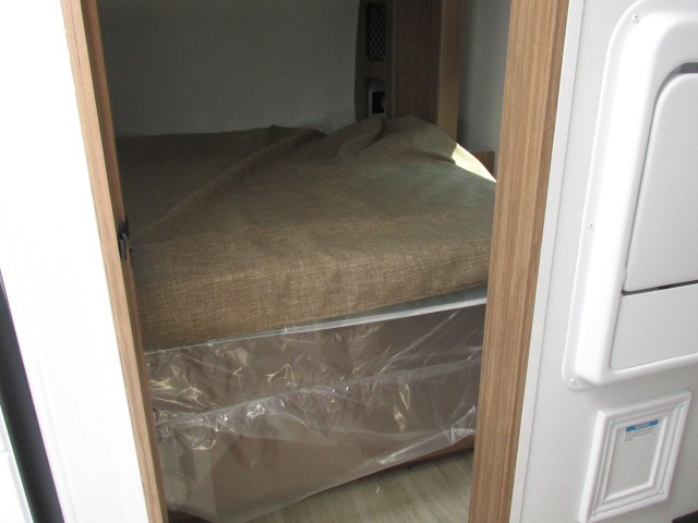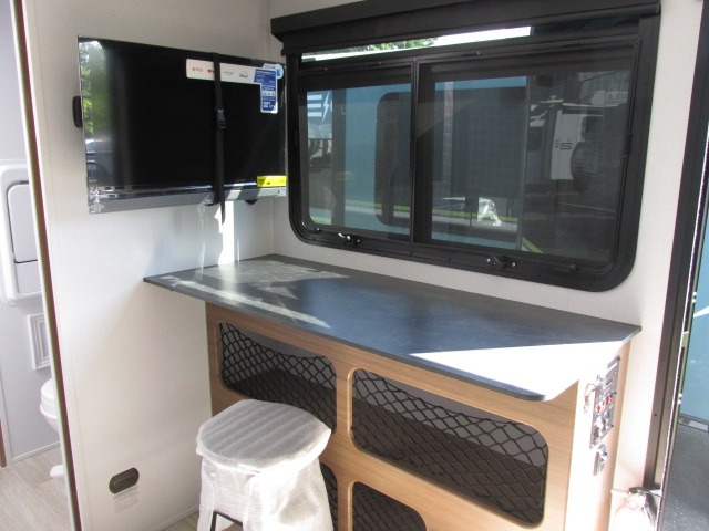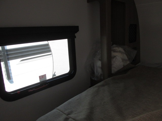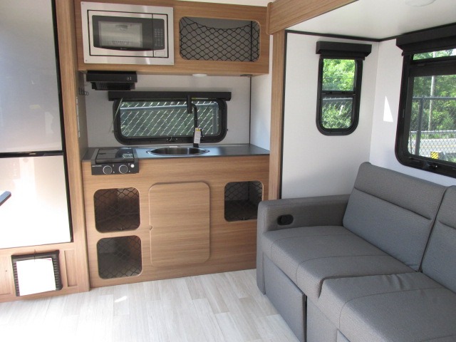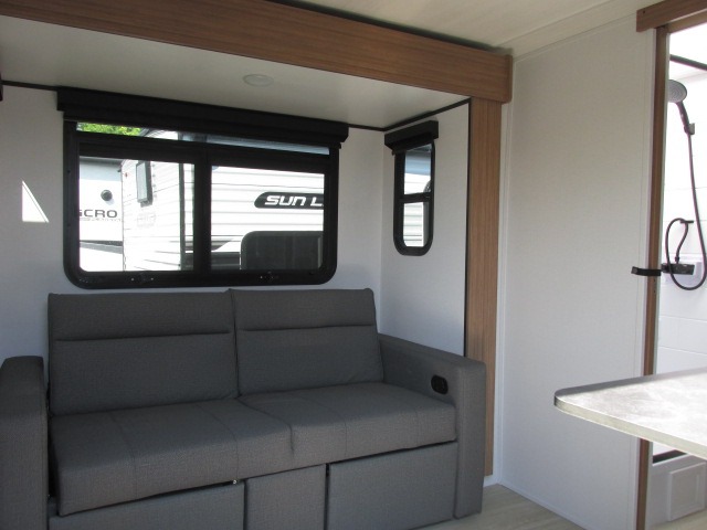 You will love this travel trailer's stunning rear kitchen design! The theater dinette provides a comfortable spot for meals and relaxation, while the bar countertop with stools offers a space for socializing and enjoying drinks. Also, overhead cabinets provide ample storage for your kitchen essentials. In the center of this travel trailer, the walkthrough bathroom features a convenient flip-down sink and linen closet, making it easy to get ready and stay organized. Moreover, the front bedroom is a serene retreat, featuring a spacious 60” x 74” bed with cubbies beside the bed for storing your favorite books, glasses, or other personal items. Plus, a 13' awning provides shade and protection from the elements, creating a comfortable outdoor living space.