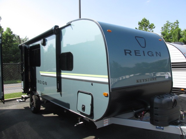 The Reign travel trailers by Keystone are premium single-axle units that are sure to make an impression at the campground. Each one is built with an exclusive automotive-finished aluminum exterior, a walkable roof, and a 100% composite floor for added durability. There are also tinted safety glass windows, quick drop stabilizer jacks, and an exterior shower with hot and cold water. The European inspired interior design is unique and cozy, and the 78" interior height will give you plenty of space to move about. You will also enjoy the ultra bright LED light strip and solid surface countertops in the kitchen, along with blackout night shades, and many more interior comforts.