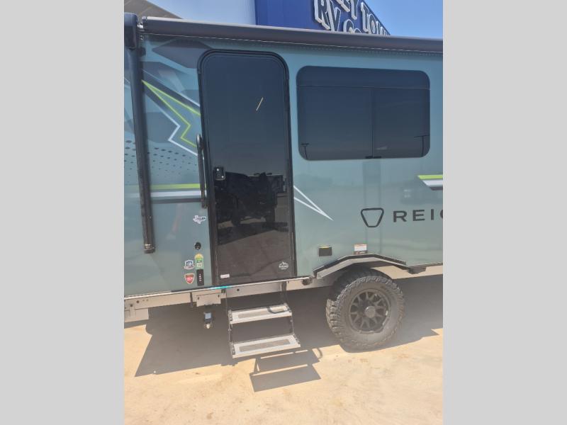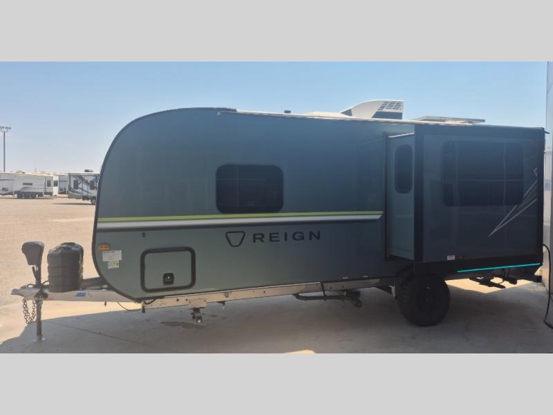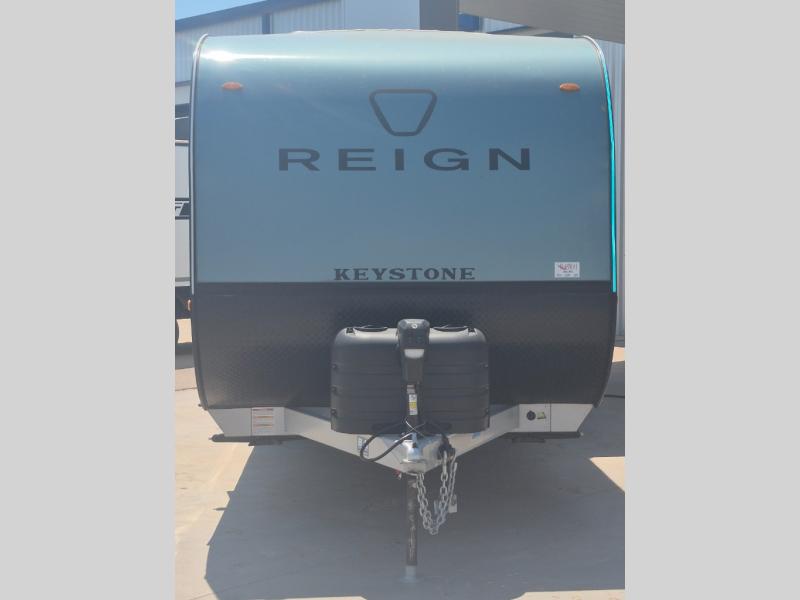 The Reign travel trailers by Keystone are premium single-axle units that are sure to make an impression at the campground. Each one is built with an exclusive automotive-finished aluminum exterior, a walkable roof, and a 100% composite floor for added durability. There are also tinted safety glass windows, quick drop stabilizer jacks, and an exterior shower with hot and cold water. The European inspired interior design is unique and cozy, and the 78" interior height will give you plenty of space to move about. You will also enjoy the ultra bright LED light strip and solid surface countertops in the kitchen, along with blackout night shades, and many more interior comforts.
